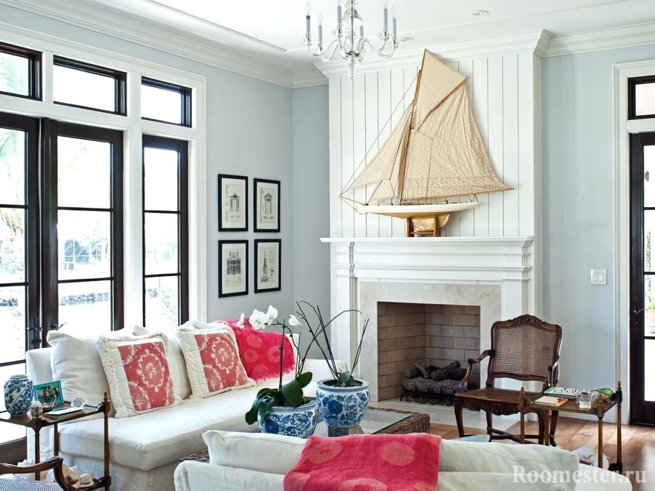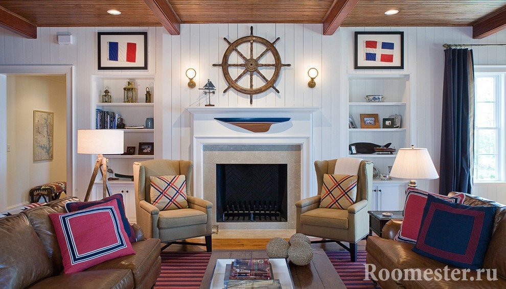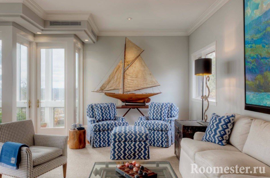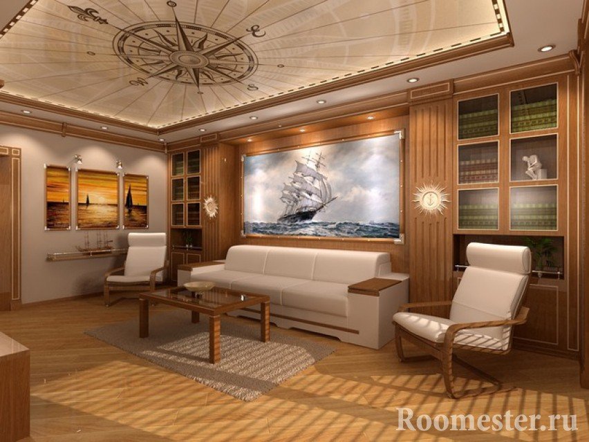 En el salón puedes poner un acuario. En la parte inferior hay un modelo de un barco hundido y tesoros piratas. En lugar de un barco hundido en el acuario, puede colocar una decoración de arrecife con muchos corales, piedras de colores y algas. En una sala de estar grande, un modelo de un barco real a menudo se suspende del techo en tamaños reducidos.