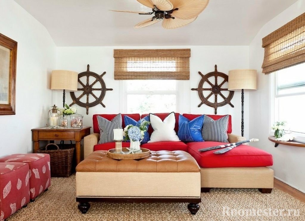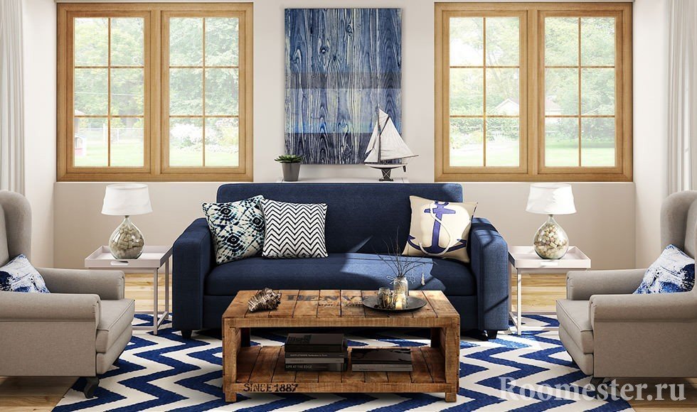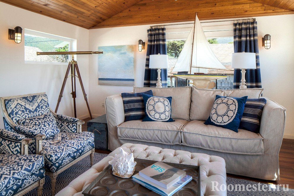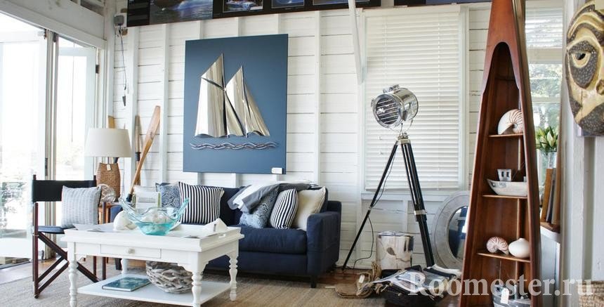 Al decorar la sala de estar, le recomendamos que considere de qué lado se enfrentan las ventanas. Para el estilo marino, se seleccionan habitaciones con vistas al sur o al oeste. En tales habitaciones siempre es brillante y soleado. El lado norte se considera más sombrío, como resultado de lo cual el tema del mar o el océano no parece alegre.