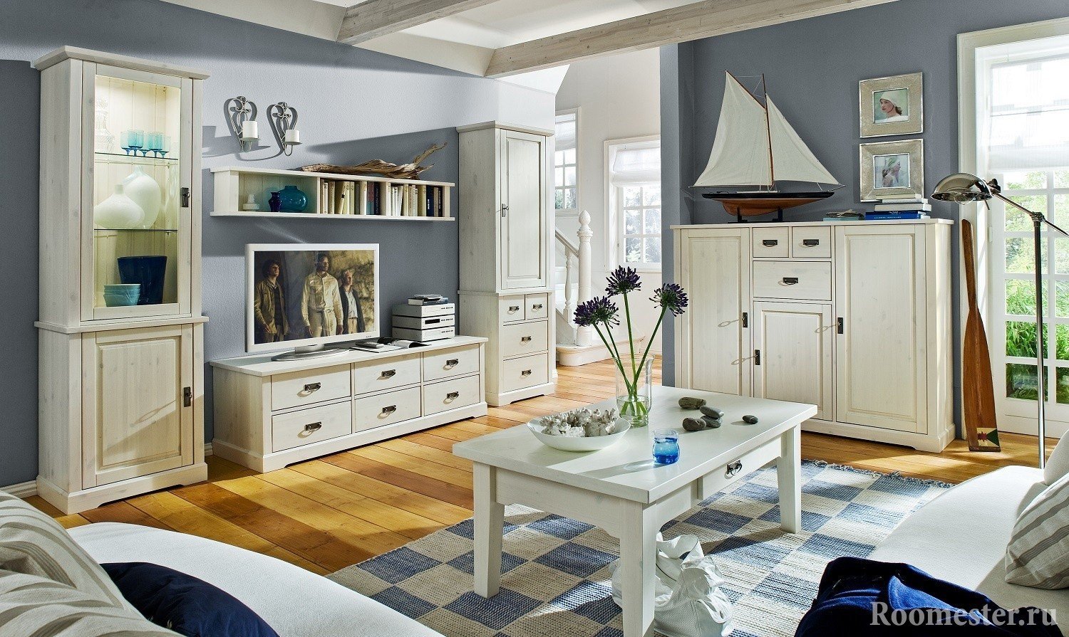Para diseñar una habitación, debe adherirse a una paleta azul-blanca, diluyéndola con materiales naturales de madera. A primera vista, tal diseño puede parecer simple, pero no lo es. La sala debe estar en armonía.