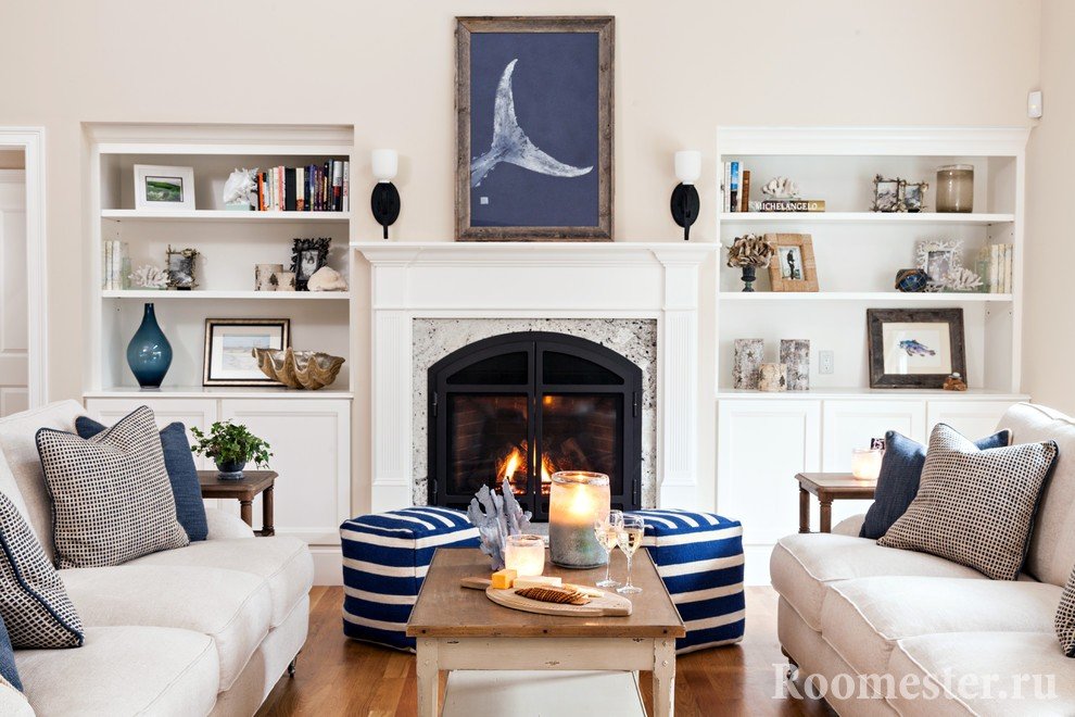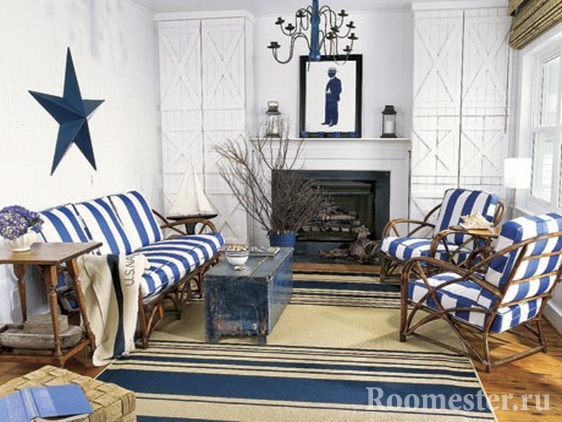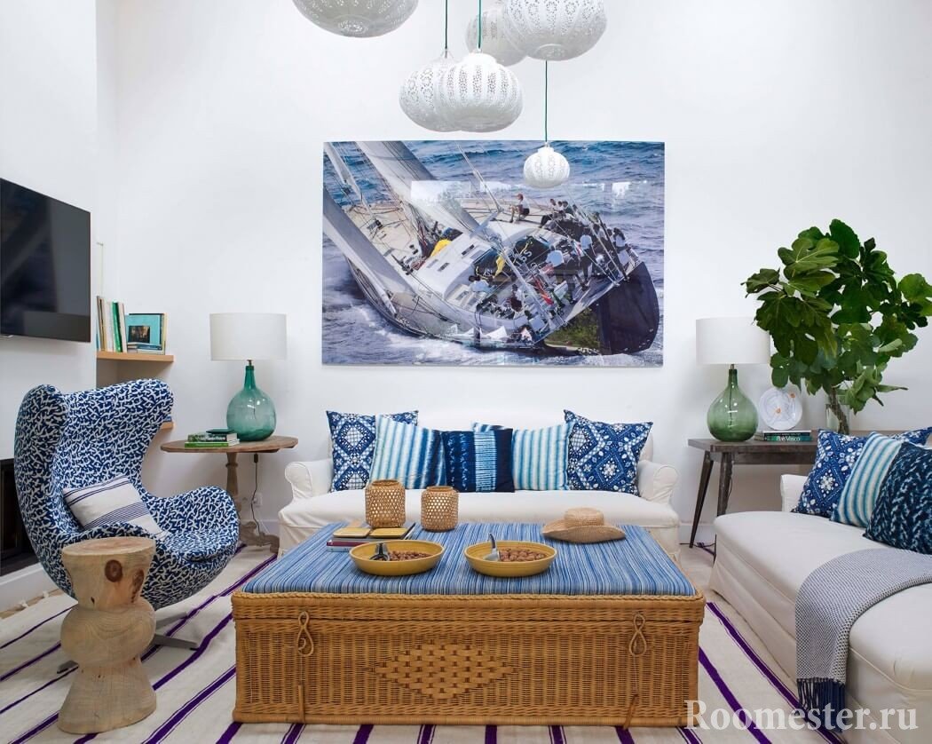 Al decorar la sala de estar, una de las paredes está decorada con murales que representan el mar. Si lo desea, más loco se cuelga en las paredes. Muchos decoran las paredes con paneles caseros de conchas naturales, piedras o productos de macramé. La decoración marina aporta originalidad a la habitación.