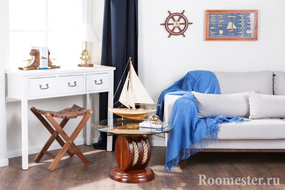 Le recomendamos amueblar adecuadamente la sala de estar. Los arreglos deben ser duraderos, de alta calidad y naturales, como en un barco. Es necesario tener en cuenta el tamaño de la sala de estar. Muebles masivos, por ejemplo, roble o fresno, se instalan en habitaciones espaciosas. Para facilitar la apariencia de la habitación, se cuelgan espejos en ella, las mesas están hechas de vidrio. Muebles de ratán o bambú se instalan en la pequeña sala de estar.