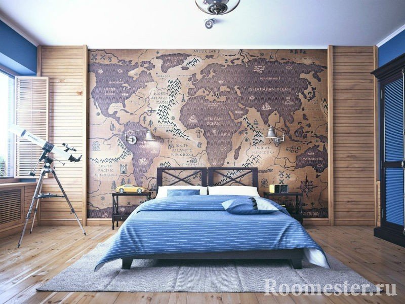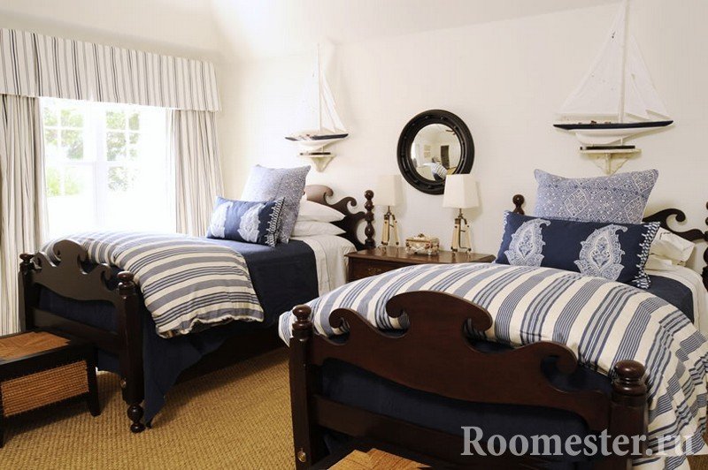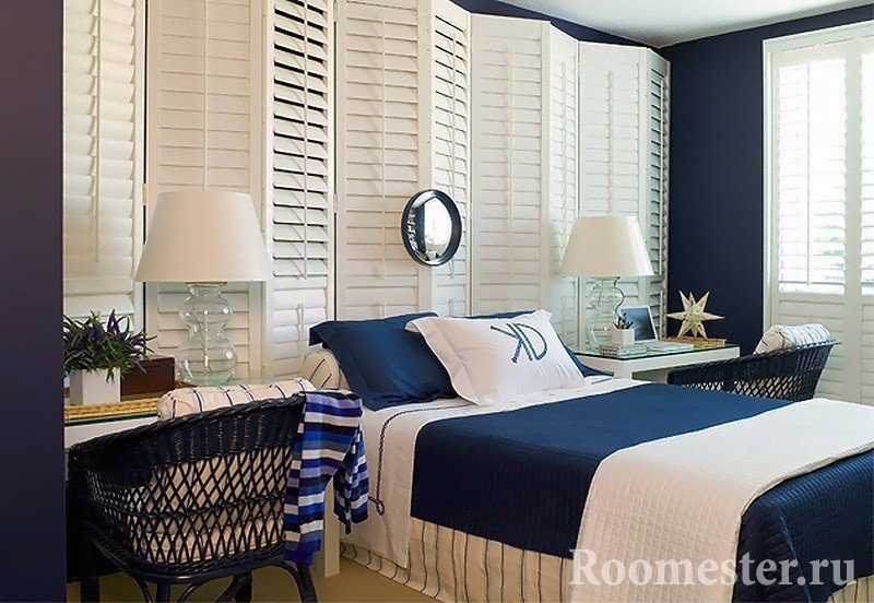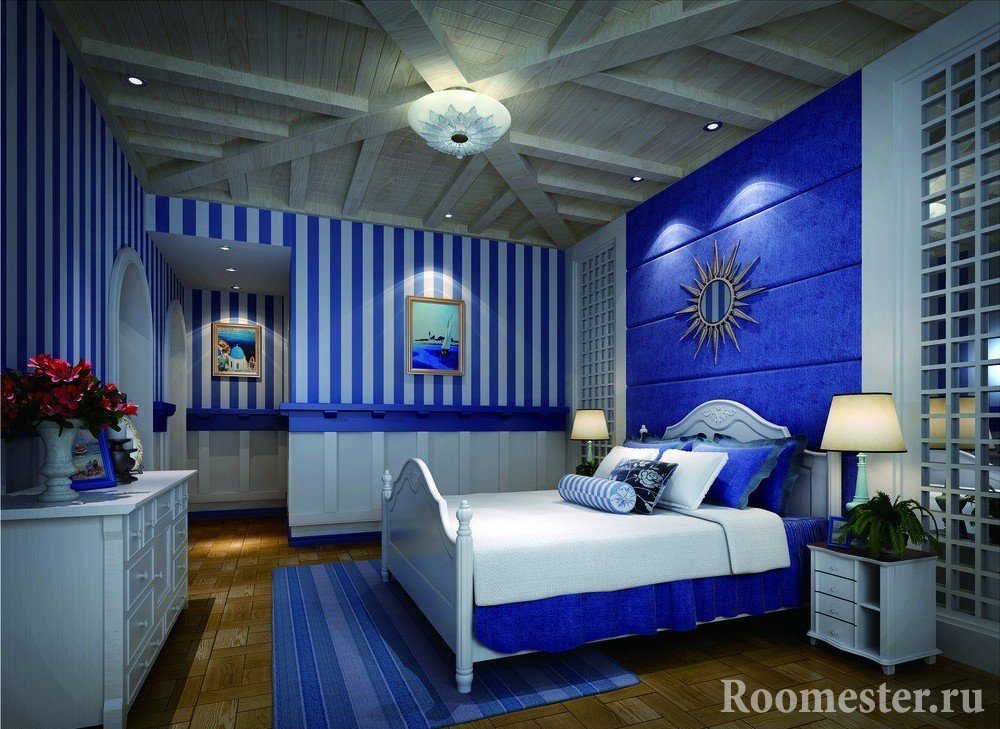El dormitorio está decorado con madera maciza, piedra natural, conchas y textiles. Se coloca una tabla de parquet o una alfombra azul en el piso. El primero crea la sensación de un paseo por la cubierta del barco. En el segundo caso, el dormitorio "se hunde" hasta el fondo del mar.