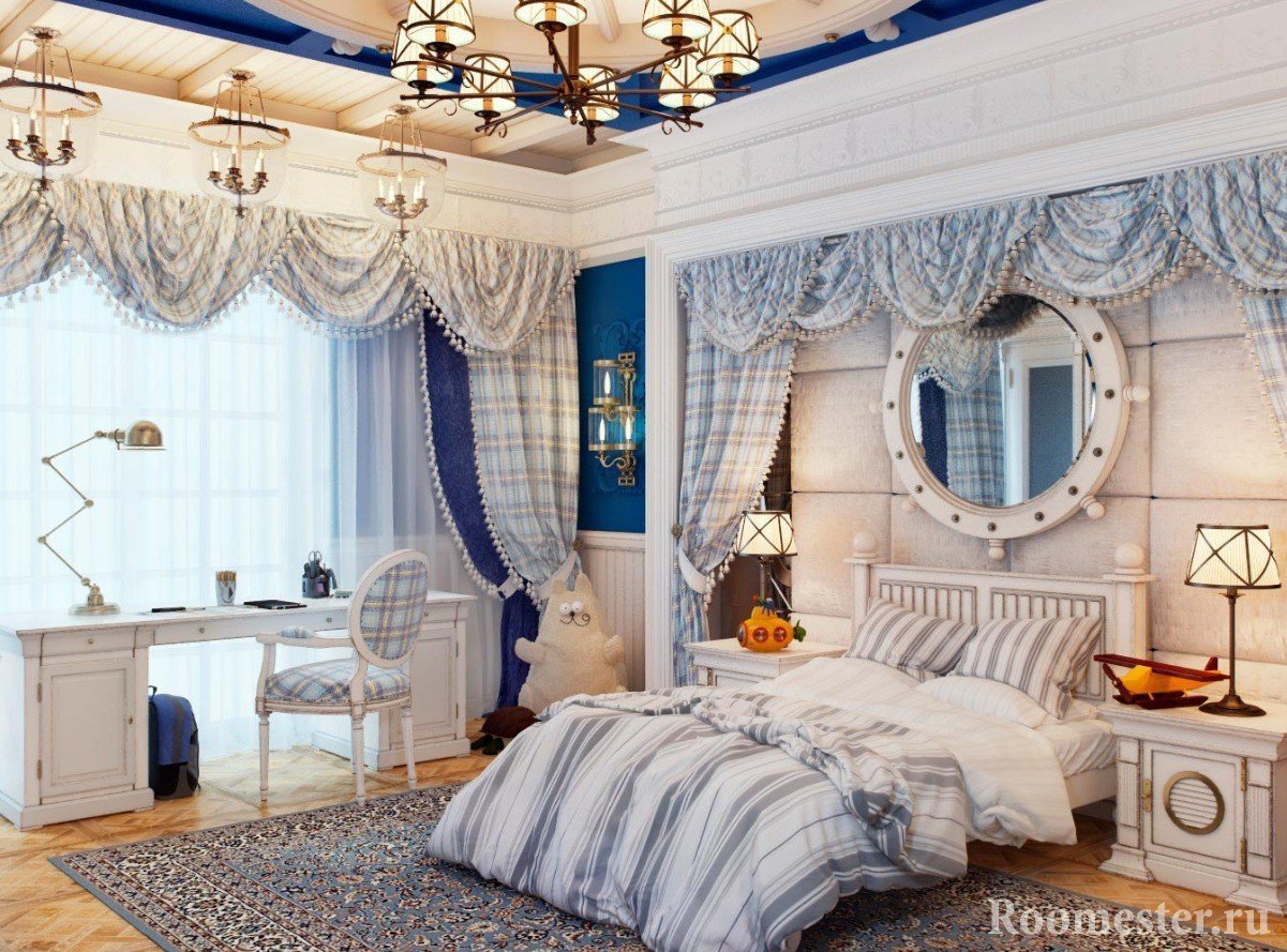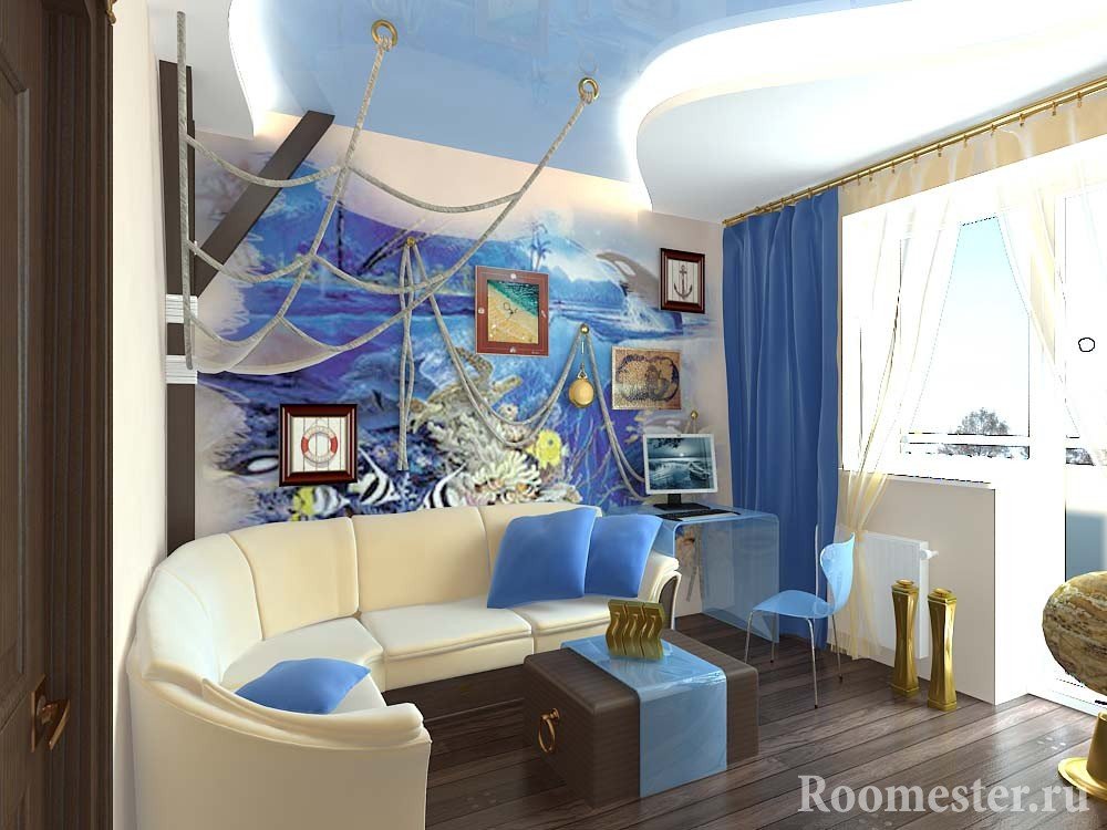 Para diseñar una habitación, debe elegir un esquema de color especial y los muebles correctos. El interior incluye temas marinos: conchas, anclas, arenisca. Las cortinas de la habitación deben ser translúcidas y el tul, sin peso. Se instalan persianas de madera en la ventana. Están decoradas con conchas. Los murales con la imagen de barcos, palmeras o el océano están pegados a una de las paredes. La sala se centra en el techo. No puede ser solo blanco y elástico, los diseñadores ofrecen techos de azul monofónico o blanco con nubes pintadas.