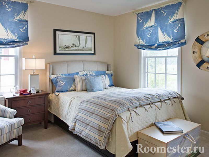 Las ventanas de la habitación están decoradas con lonas, cortinas de lino, cortinas de algodón. Están muy bien atados en nudos náuticos. La cama está cubierta con ropa de cama azul, a rayas o anclada. A veces se permite un juego de cama rojo. El dormitorio es el lugar donde puedes ir demasiado lejos con los elementos. En el diseño, debe cumplir con la regla: cuanto más simple, mejor.