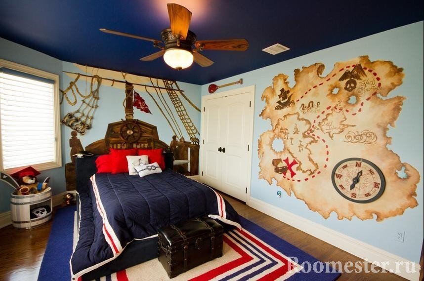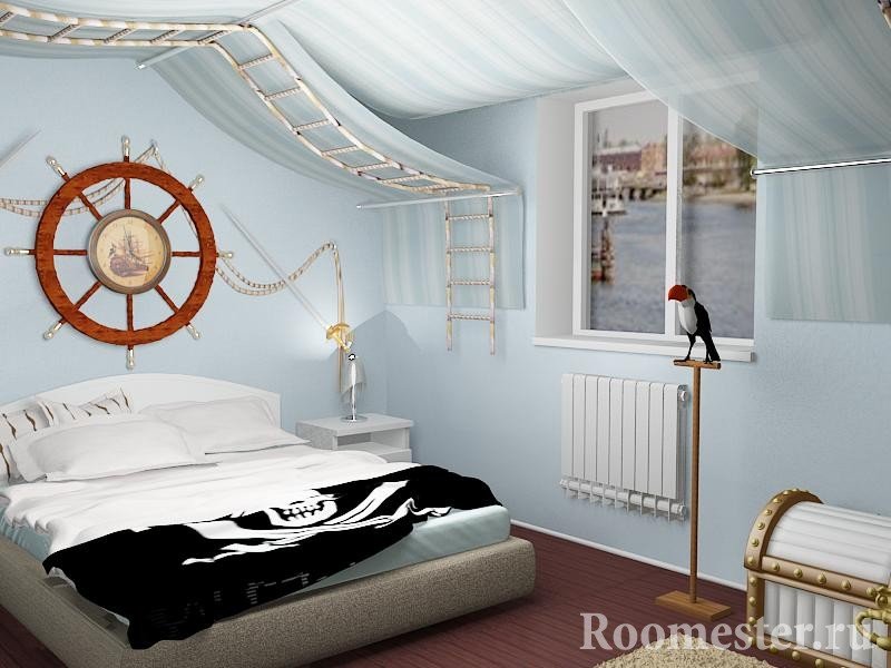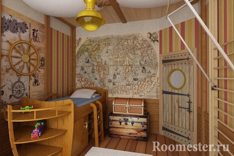 Una de las paredes está decorada con una red de pesca real o una bandera pirata casera. Algunos diseñadores crean pinturas originales. Por ejemplo, se atan nudos piratas, se colocan debajo del vidrio y se enmarcan. Tales pinturas se pueden usar en la sala de estar o en la guardería.