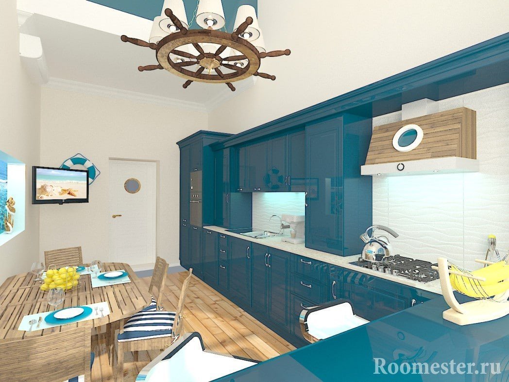 Existe la opinión de que el tema marino es bueno solo para baños y habitaciones infantiles. Sin embargo, es adecuado para el diseño de cocinas. Las cocinas de este estilo se ven originales y frescas.