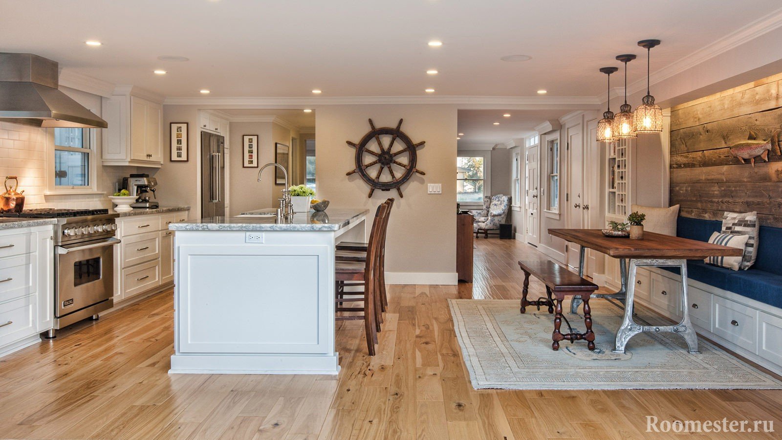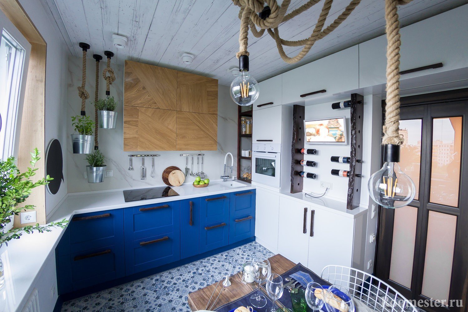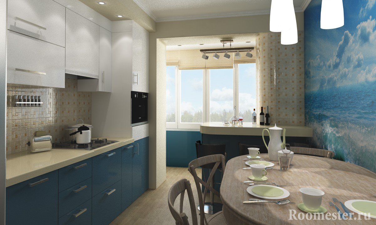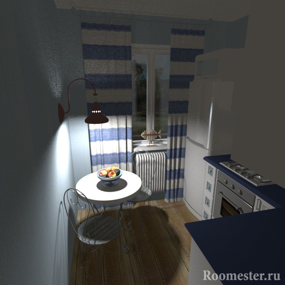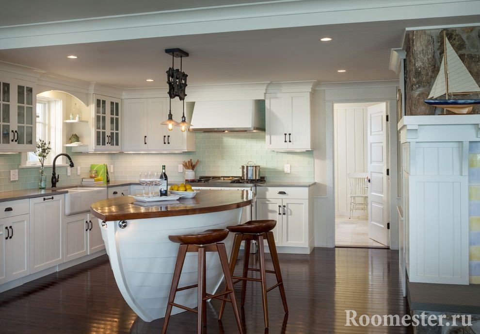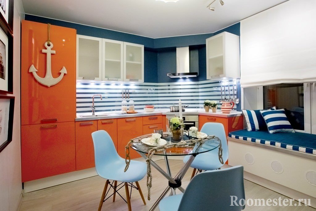 El diseño interior llamado "goleta de pescador" se basa en el uso de redes, muebles de comedor, objetos antiguos, estantes de madera abiertos, cuerdas. Este interior se puede transformar en una "villa junto al mar", si oculta las redes y cuerdas, pero cuelga un tul ligero y coloca macetas con plantas de interior y decoración del hogar en las ventanas. Una mesa rugosa está cubierta con un hermoso mantel y se arrojan lindas almohadas a los bancos. El interior intercambiable nunca molesta, pero puede cambiar la cocina más allá del reconocimiento sin mano de obra y reparación.