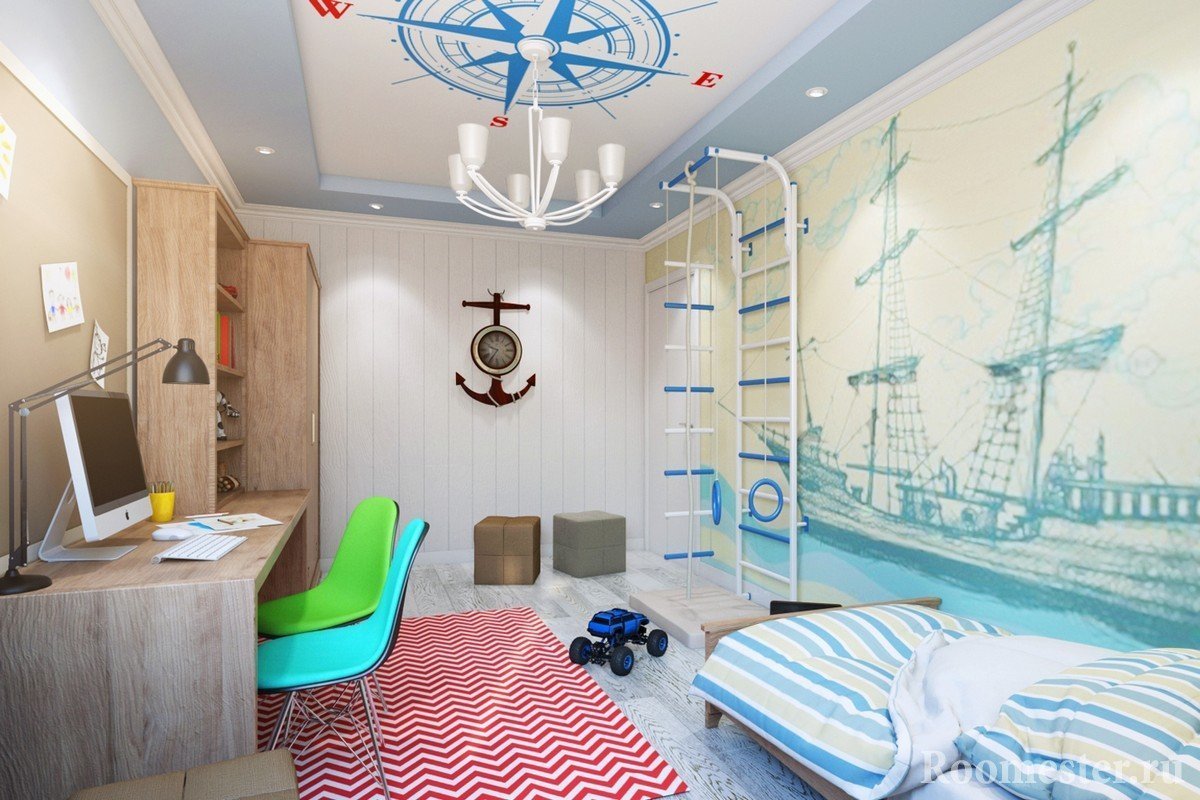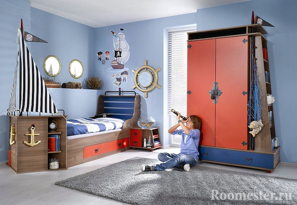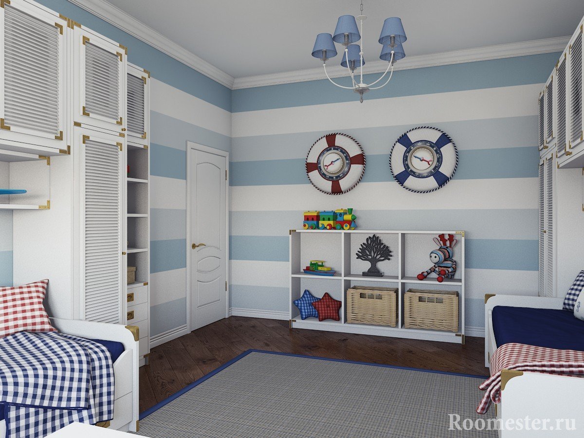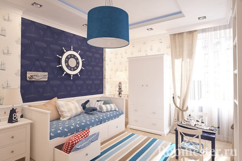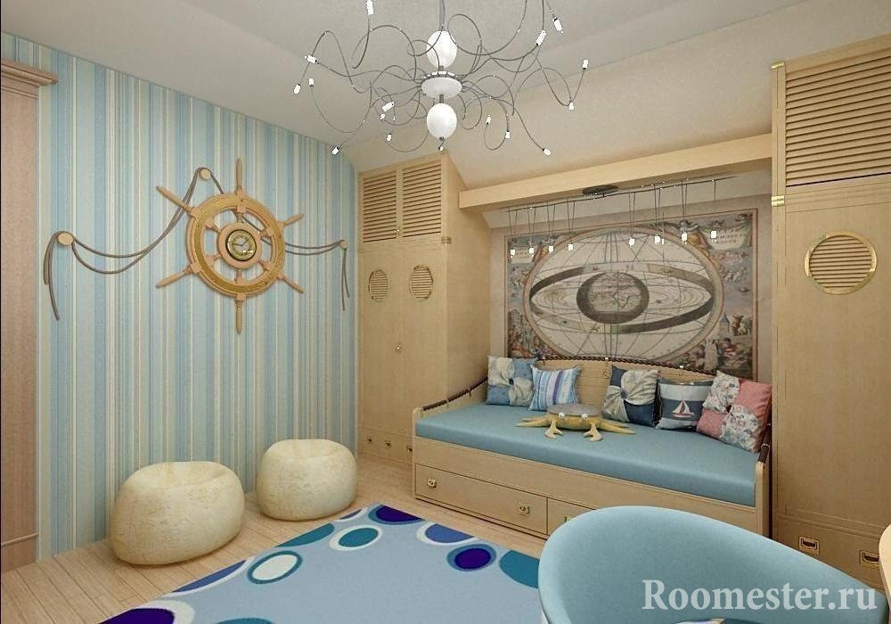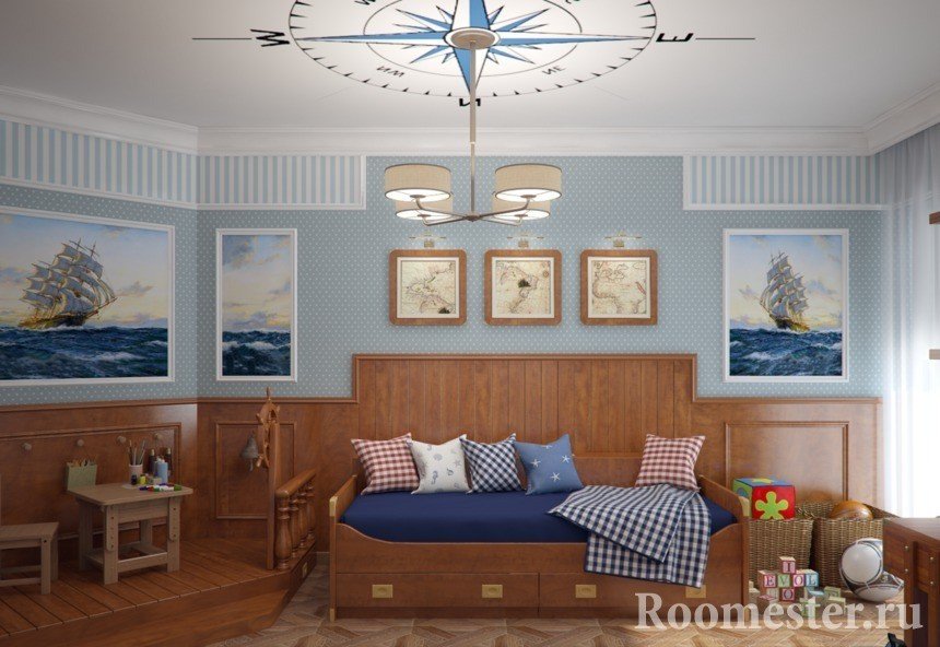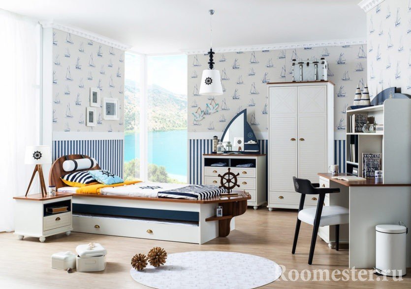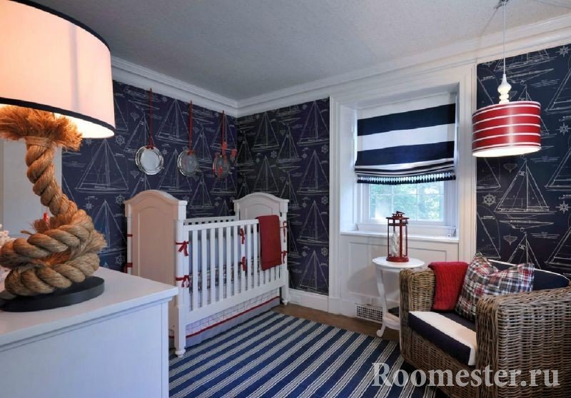 Los niños varones prefieren un tema náutico. Se instalan muebles masivos en los viveros, y se eligen decoraciones toscas como anclas, dispositivos de navegación simulados, etc.Al decorar las paredes, se detienen en papel pintado a rayas. Muy a menudo, los padres compran una cama para el niño en forma de barco.