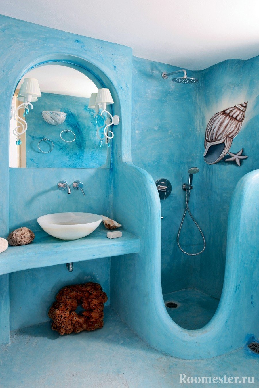 El baño se puede decorar en tonos azules y arena.Las paredes están niveladas y pintadas con pintura monofónica opaca o con azulejos. Marens a menudo se instalan sobre el baño. Si el presupuesto lo permite, puede aplicar alivio a una de las paredes y teñirlo con una miga de piedra natural.