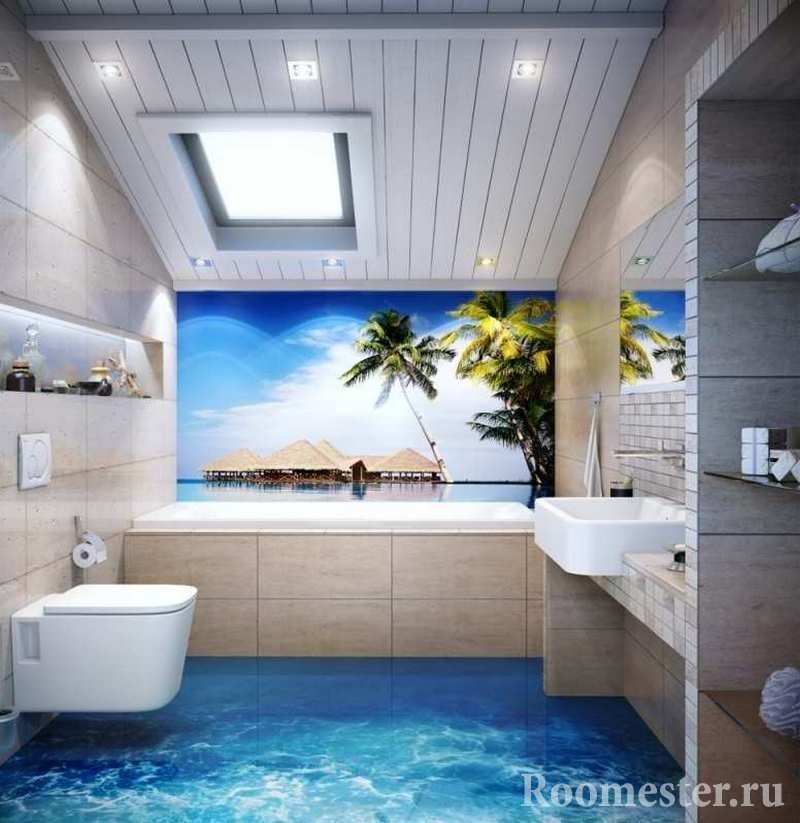 El estilo marino en el baño implica el uso de madera maciza y piedra natural. Para diseñar un baño, debe elegir el piso adecuado. Mire inusualmente pisos 3D a granel, recreando el mundo submarino. Una opción más clásica es el gres porcelánico con insertos de piedras naturales. Algunos eligen mosaicos azules. Al colocar el piso, puede combinar varios recubrimientos texturizados, por ejemplo, piedra natural y un laminado resistente a la humedad.