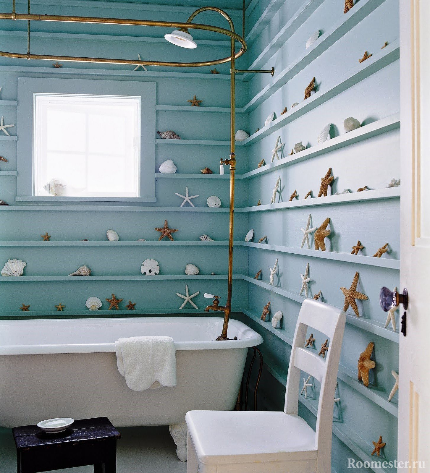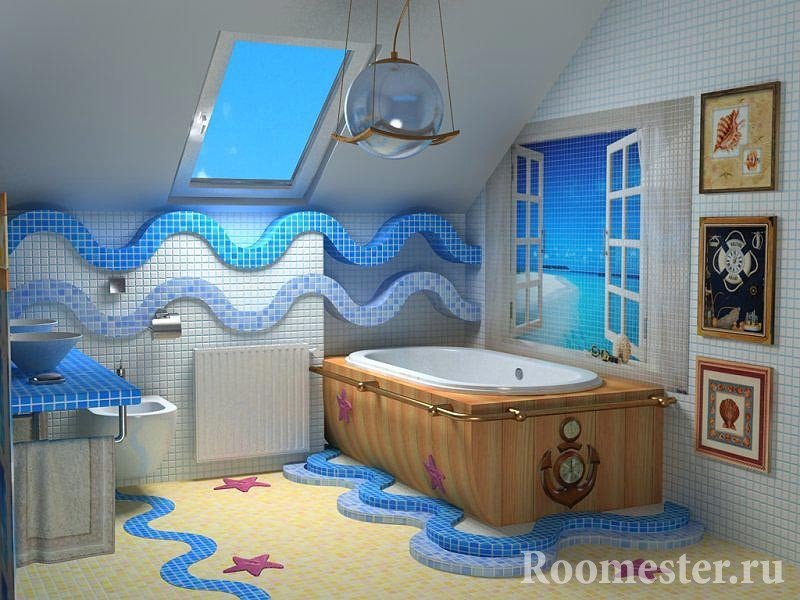 El diseño de la habitación implica el uso de varias decoraciones en forma de conchas y estrellas de mar. Los artículos se colocan alrededor del perímetro del baño. Para cepillos de dientes y jabones obtienen accesorios marinos para el interior. Entonces el baño brillará con nuevos colores.