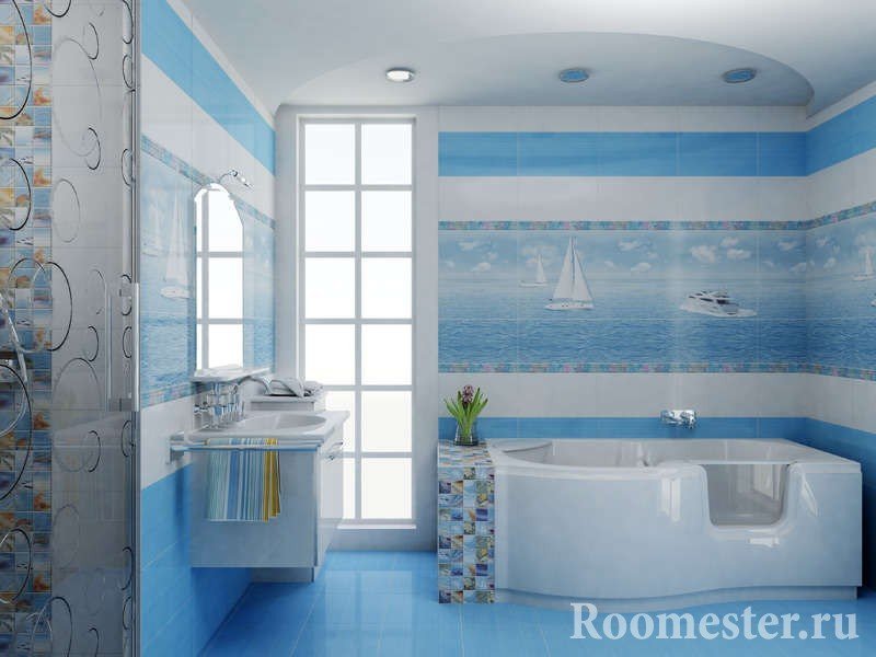 Los motivos del agua no deben sobrecargar la habitación. Ella debe permanecer aireada. En una habitación pequeña, se aplica un mínimo de detalles. Para la habitación estándar, se utiliza un color primario, que se complementa con un tono contrastante y un par de detalles brillantes.