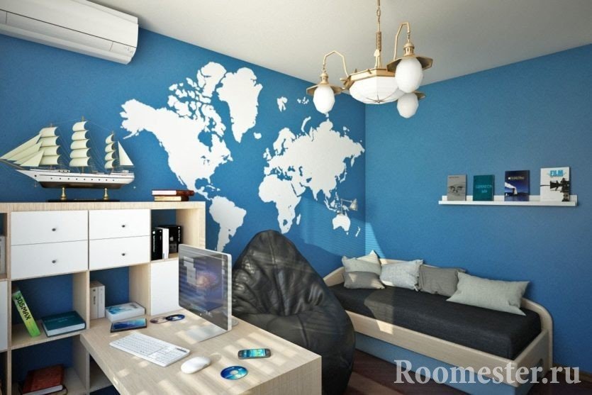Al decorar las paredes combinan varios colores. Por ejemplo, el fondo de pantalla a rayas en contraste está pegado. La pared pegada se usa como una mancha de color para los accesorios. La habitación para el niño debe ser divertida, por lo que se diluye con elementos de colores, conchas. En tal habitación, haga detalles de color naranja o rojo.Puedes crear tu propia decoración.