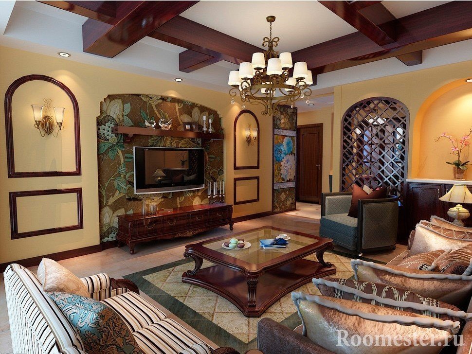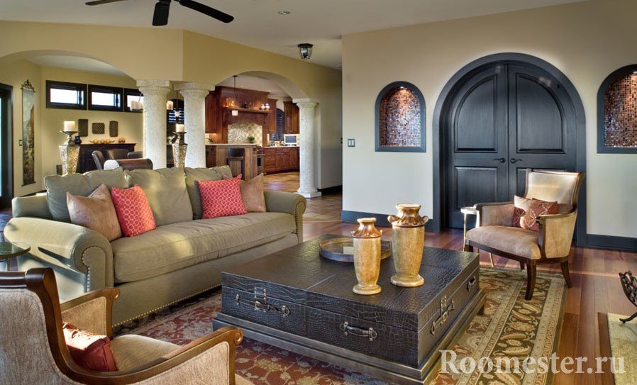 Un grupo separado es la dirección árabe. Esto incluye las direcciones nacionales de Argelia, Marruecos, Turquía y Egipto. Casi no se usa en su forma pura. Una característica distintiva son las muchas almohadas en el piso, sofás bajos, mesas. Una gran cantidad de patrones nacionales en mosaicos, telas tejidas, muebles tallados distinguen claramente estos estilos, lo que le permite ser fácilmente reconocible. También puede reconocer fácilmente la presencia de pinturas y frescos que son de naturaleza religiosa.