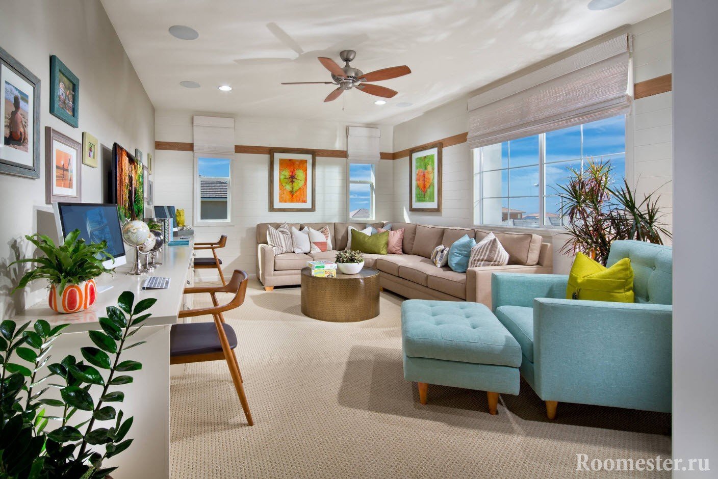 La paleta de colores posible depende de la elección del color primario. Blanco, gris, beige o beige, amarillo o rosa, el beige se combinará perfectamente. Blanco, beige, rosa, azul, marrón son perfectos para el gris. Al elegir el verde como color principal, puede elegir entre varios: blanco, beige, marrón, gris. Jugar con tonos verdes traerá muchos beneficios al interior. Por ejemplo, el estudio se puede pintar en color verde oliva y el dormitorio es de color verde claro. Todavía se combinarán y armonizarán. Naranja, blanco, verde, gris son perfectos para el amarillo.
