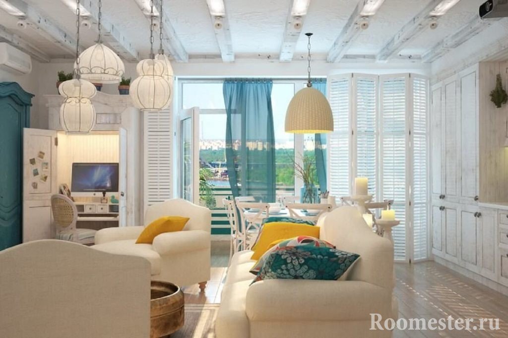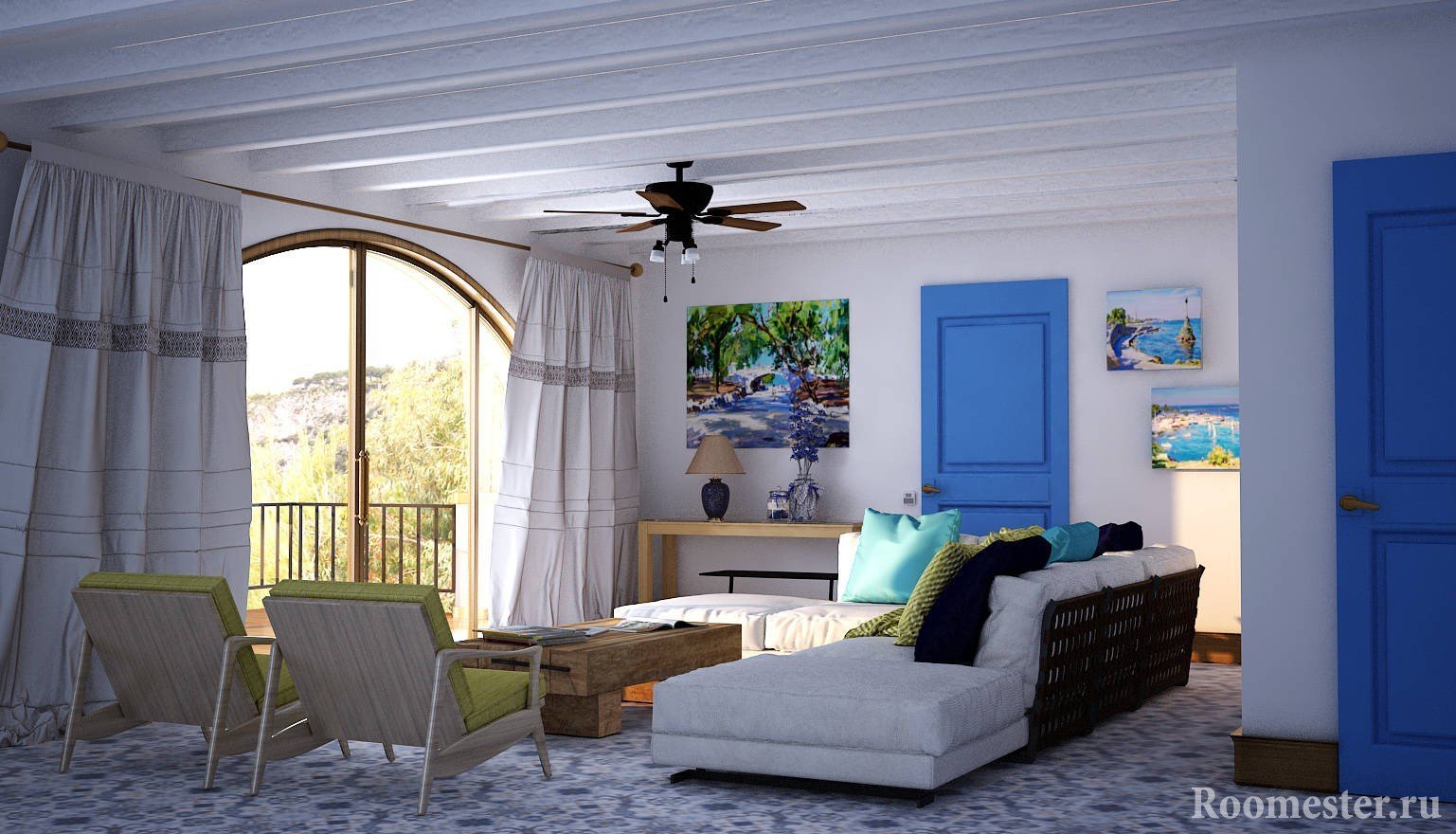 El estilo griego se caracteriza por el uso máximo del blanco, combinando con azul o azul. Los griegos le dan al estilo mediterráneo un toque de antigüedad, que se nota especialmente en el deseo de grandes espacios. Muy adecuado para el diseño de un apartamento tipo estudio, planificación libre, utilizando enfiladas de habitaciones que están separadas solo por arcos. Además, le permite distribuir uniformemente el aire frío en toda la habitación.