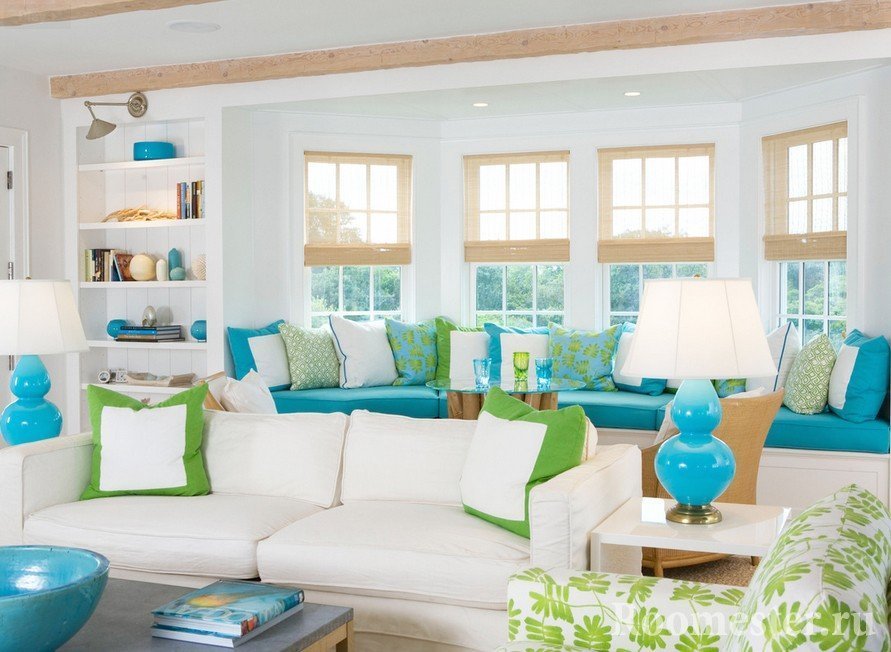Todas las pinturas que se utilizan para decorar casas al estilo mediterráneo son frescas, ligeras, dotadas de naturalidad. Una amplia gama de colores: del blanco al verde intenso o azul. Colores amarillo, dorado, beige, rosa: todos se utilizan en todos los colores. Es importante determinar el color principal del interior, luego pasar a colores complementarios que estarán presentes en los elementos de decoración.