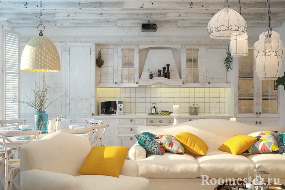 La luz solar es uno de los conceptos básicos, por lo que no debe ahorrar en iluminación. La opción clásica son los focos de techo, hermosas lámparas, candelabros y focos que cuelgan de vigas de madera. Harán que la casa sea cálida, acogedora. Al elegir accesorios, debe guiarse por el tamaño de la habitación, el esquema de color de su diseño, para que no introduzcan disonancia en el interior general. Es necesario utilizar tantos accesorios de iluminación que sean suficientes para simular la luz solar incluso de noche. Las diferentes lámparas de pared y piso que pueden enfocar la luz en artículos de decoración se verán igualmente beneficiosas. Colocar tiras de LED alrededor del perímetro completo del techo es otra buena solución. Los LED tienen buena potencia de iluminación con un consumo mínimo de energía.