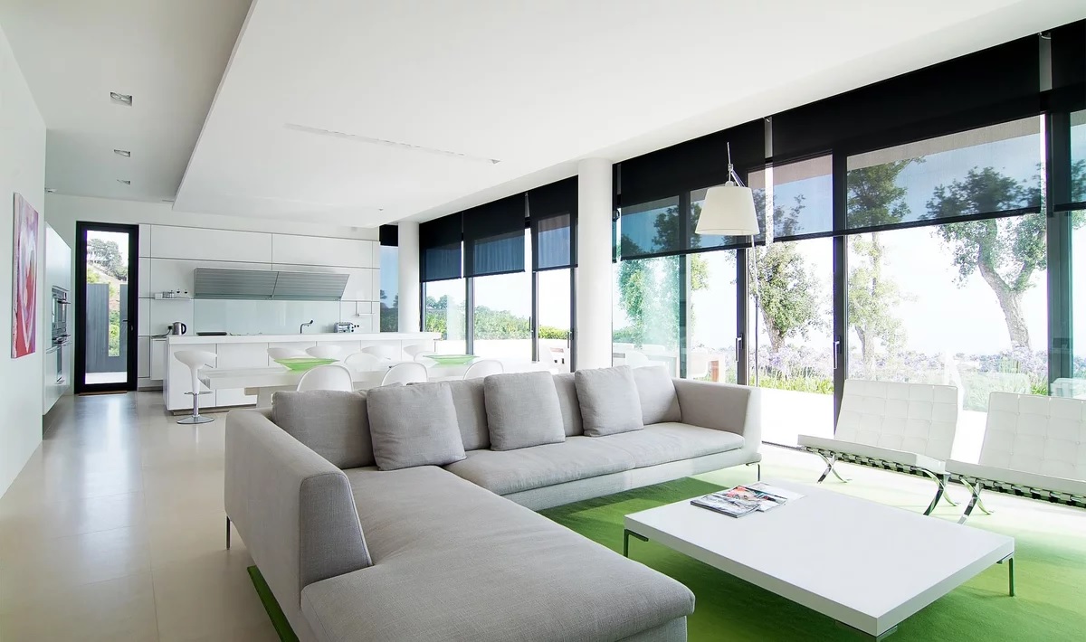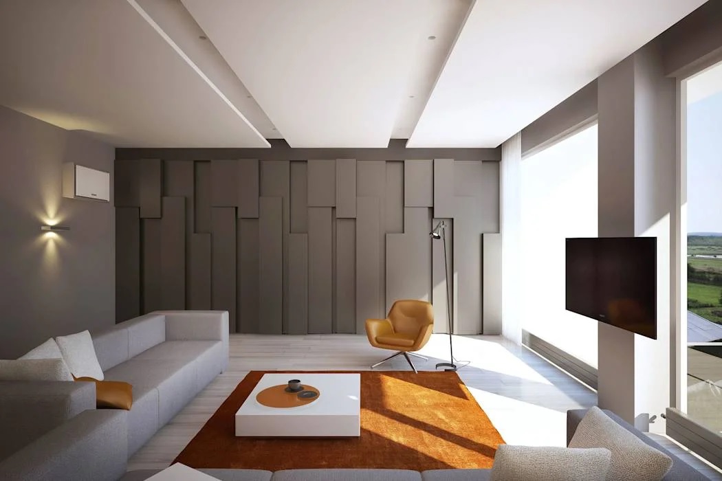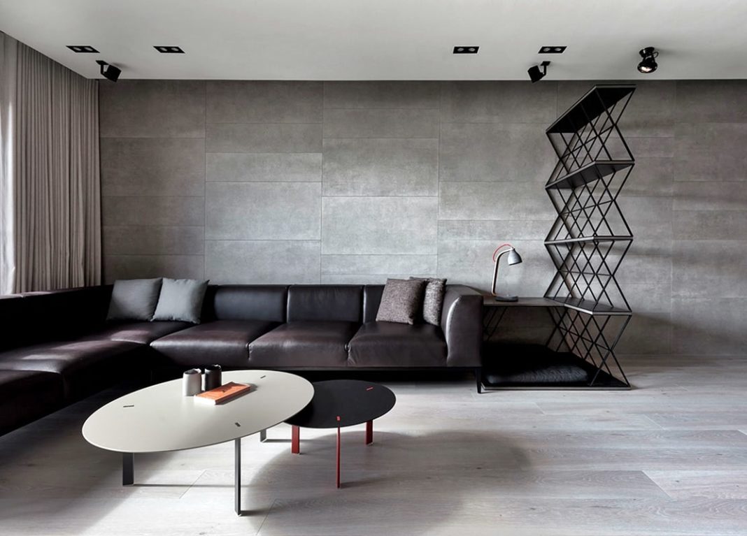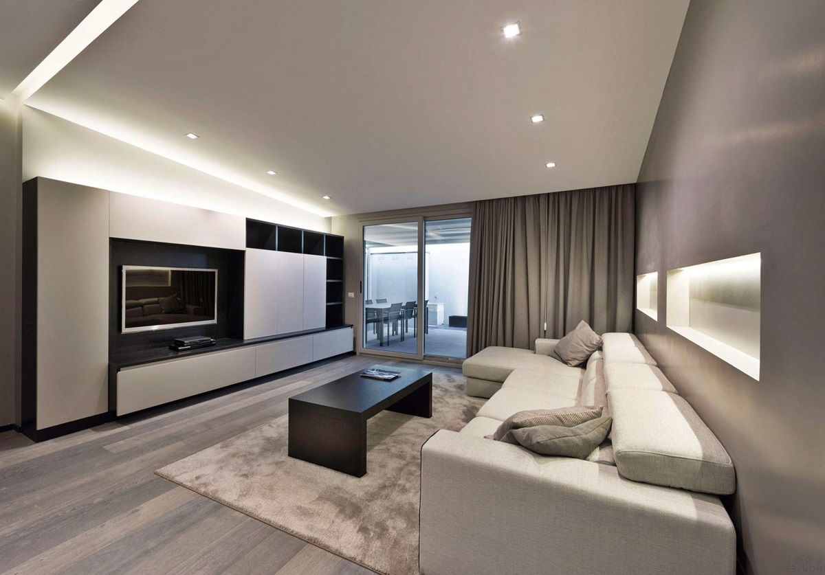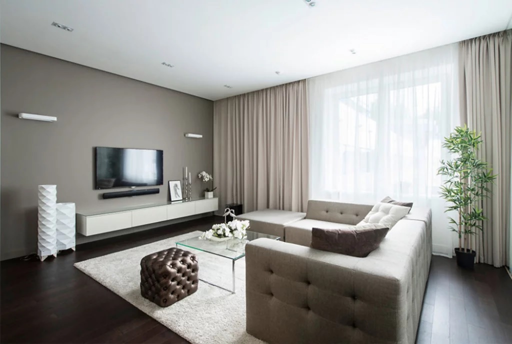 La sala de estar al estilo minimalista debe ser espaciosa y luminosa. Hay un sofá en el centro de la habitación. Los muebles tapizados deben tener formas simples sin partes laterales voluminosas. Puedes usar una mesa baja de cristal, una estantería original.