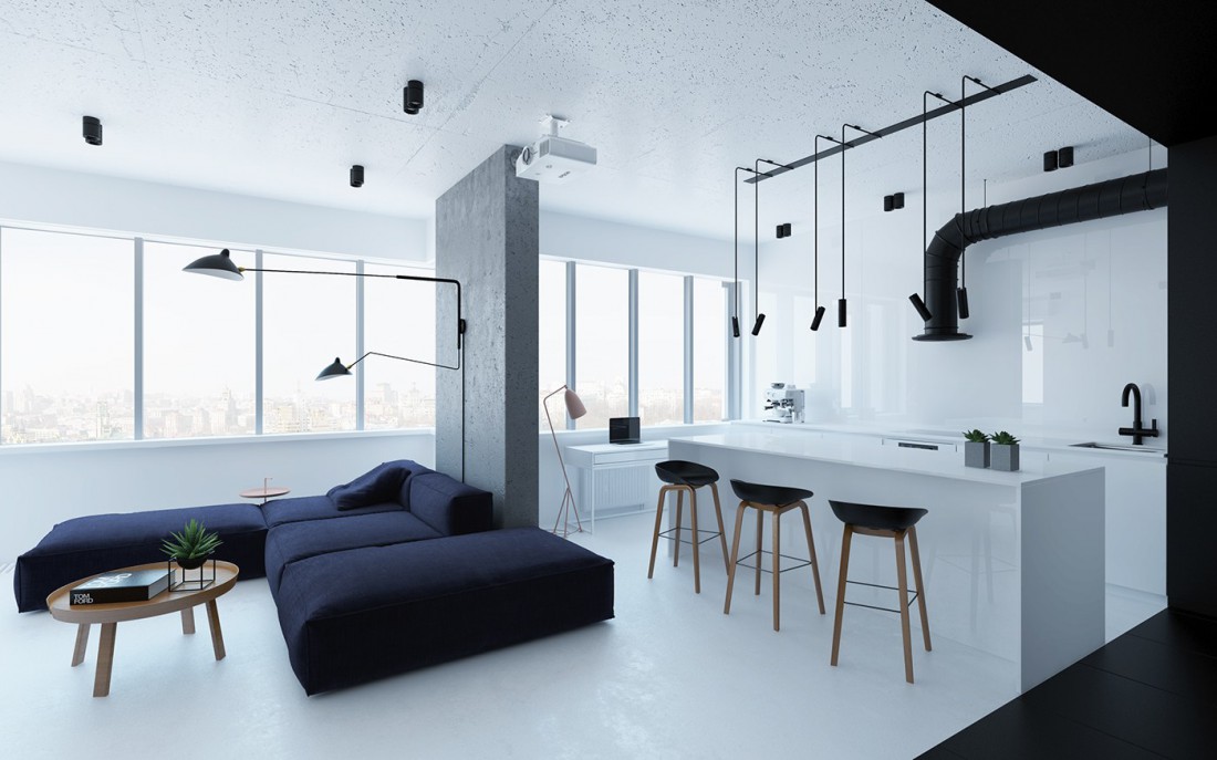 La base en la dirección del color puede ser uno o dos colores. Estarán presentes tanto en materiales de acabado como en muebles. La pureza y la expresividad se indican en blanco. Para enfatizarlo, usan imágenes brillantes, superficies oscuras.