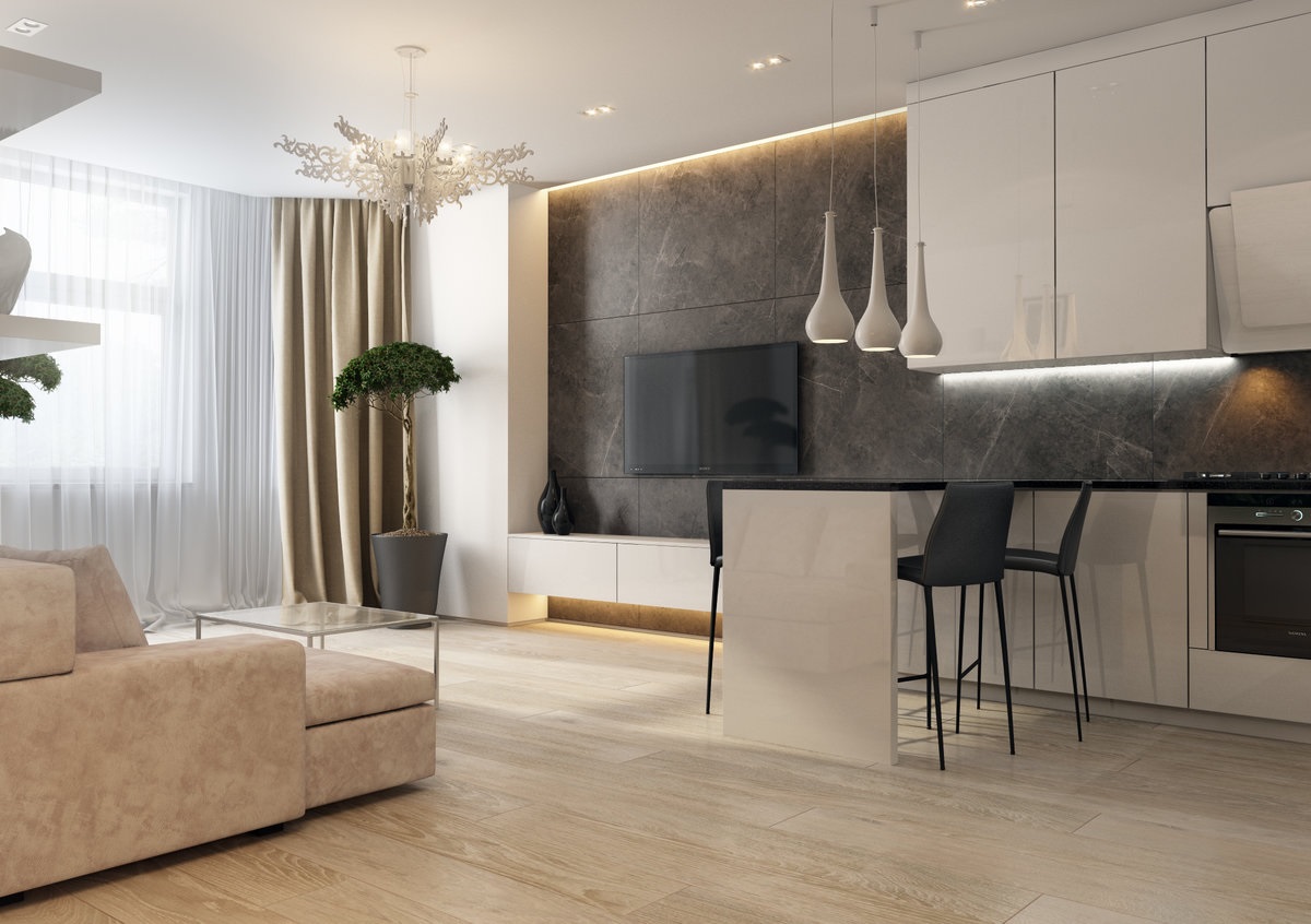 La sala de estar en un estudio se incrementa por todos los medios disponibles. Puede eliminar particiones, combinar habitaciones, usar trucos con iluminación. Las ventanas de una habitación minimalista rara vez tienen cortinas. Para crear comodidad en la noche, puede usar cortinas romanas para las aberturas.Como iluminación artificial, se utilizan lámparas integradas en el techo y en los muebles. Las lámparas esféricas y las pantallas de forma irregular son populares.