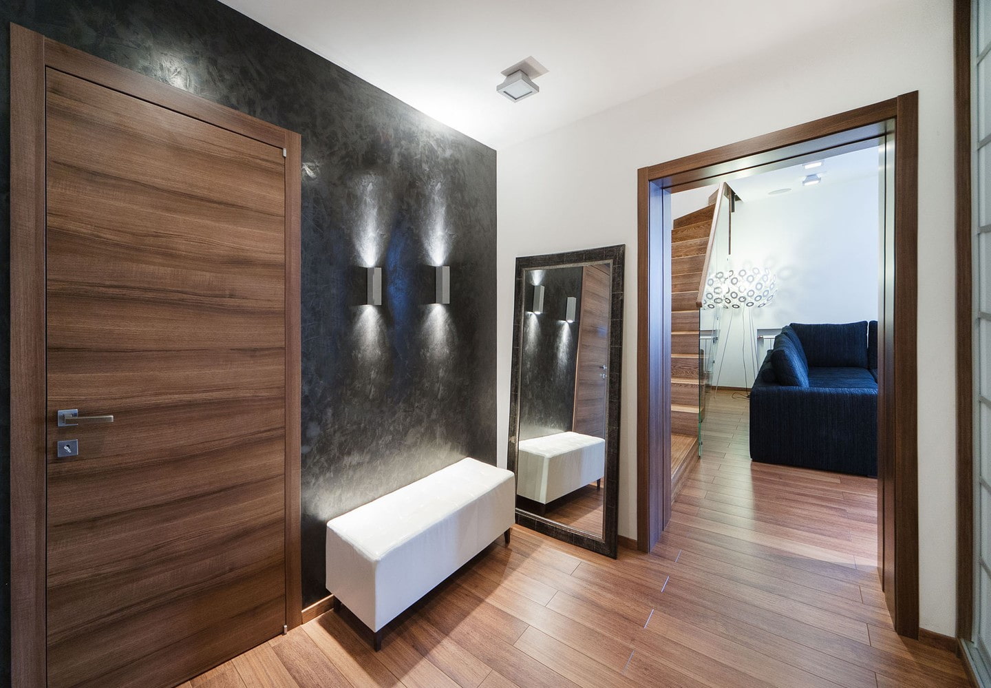 La gama fría es más adecuada para un hall de entrada. Para habitaciones espaciosas - colores saturados, para miniaturas - suaves y apagadas. El color del piso debe elegirse solo de forma natural. Para que la habitación no parezca un baño, no se recomienda usar cerámica y linóleo blanco.
