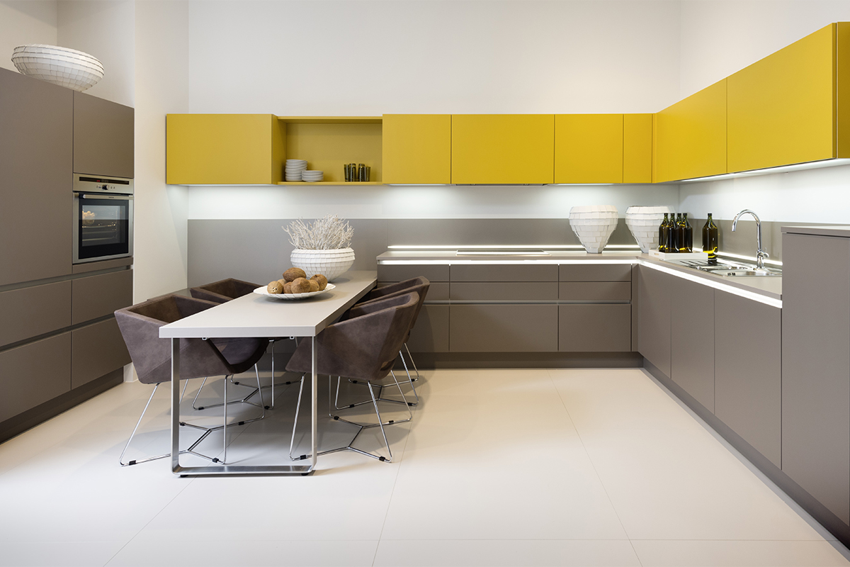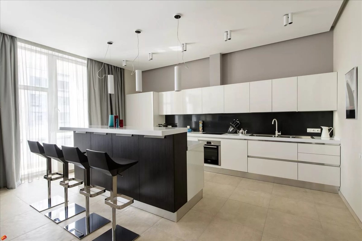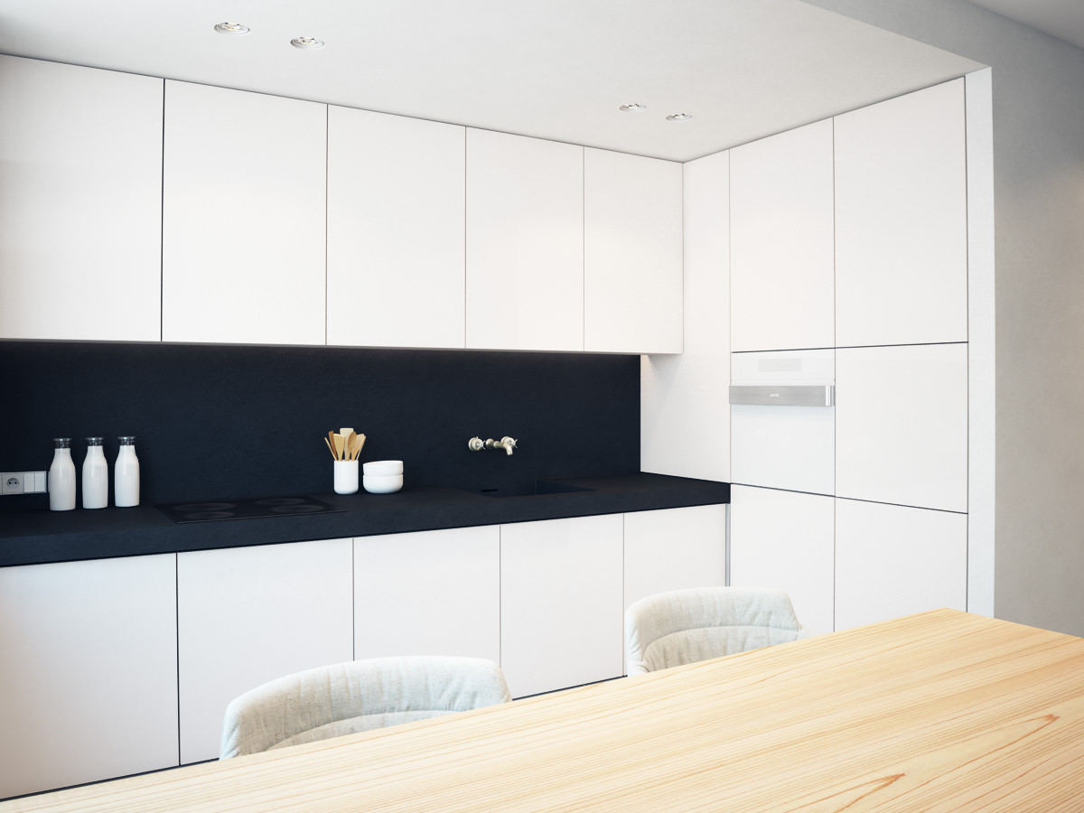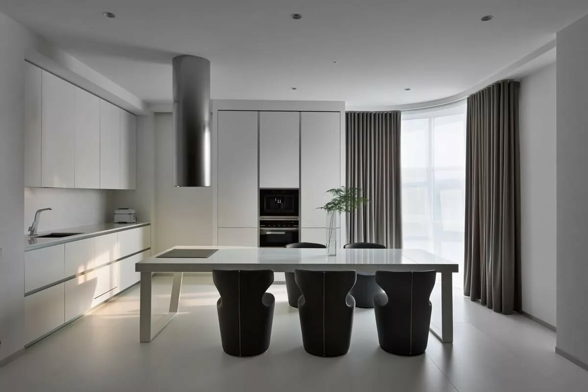 Los muebles en una cocina de este tipo solo se pueden hacer a pedido, en un estilo sobrio y moderno. Tales proyectos demuestran alta funcionalidad, simplicidad y elegancia. En una habitación espaciosa, dejan un lugar en el centro para la isla. En dicha cocina, no solo se cocinará, sino que también se disfrutarán los platos, las celebraciones y el resto del hogar. Incluso una cocina pequeña puede ser espaciosa con superficies lisas, líneas rectas.