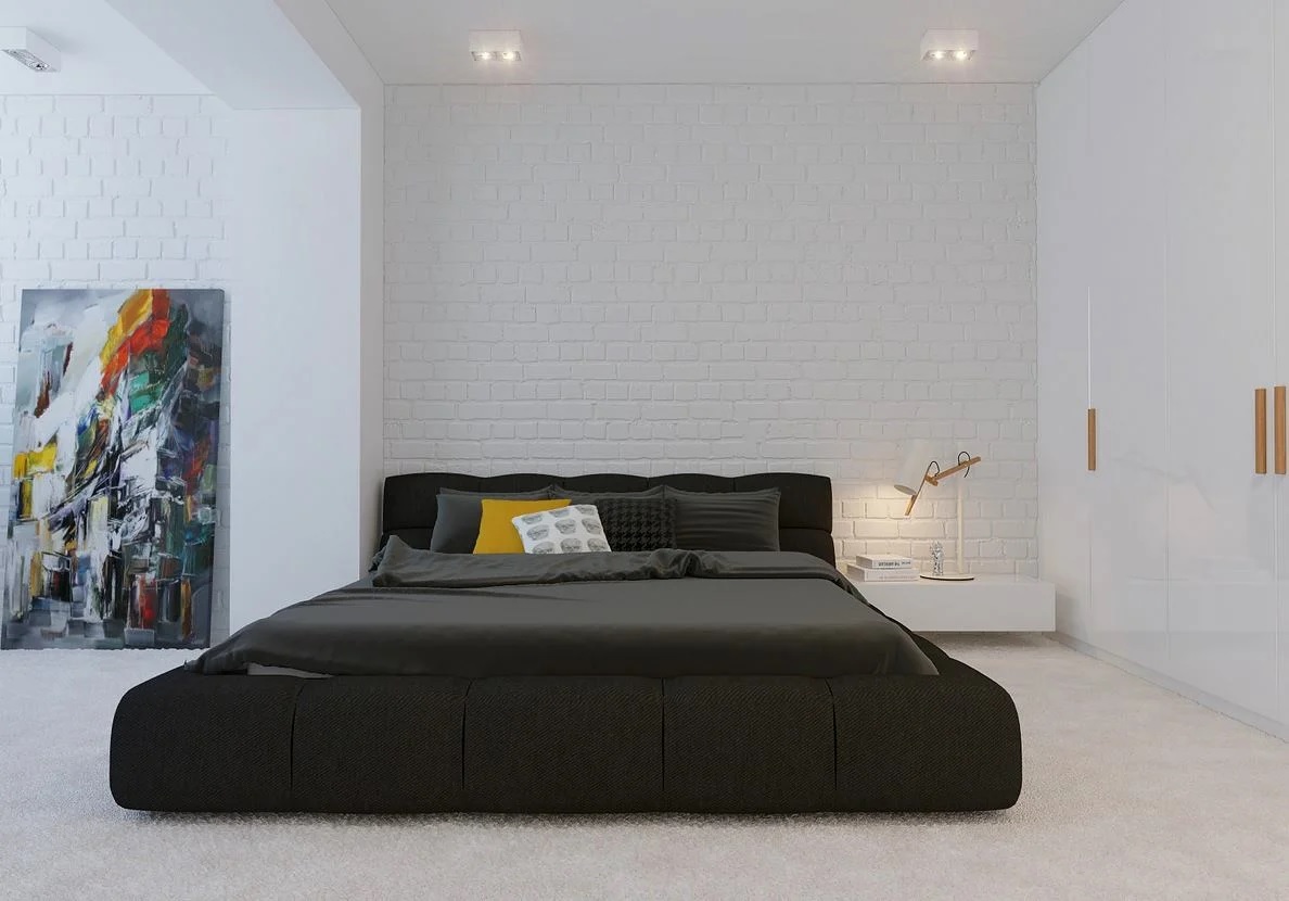 Los elementos de los muebles en el dormitorio deben estar hechos de acero, cuero, madera y otros materiales naturales. Un estante de metal y una mesa de vidrio se verán bien. Almohadas brillantes u otomanas ayudarán a diluir la monotonía.