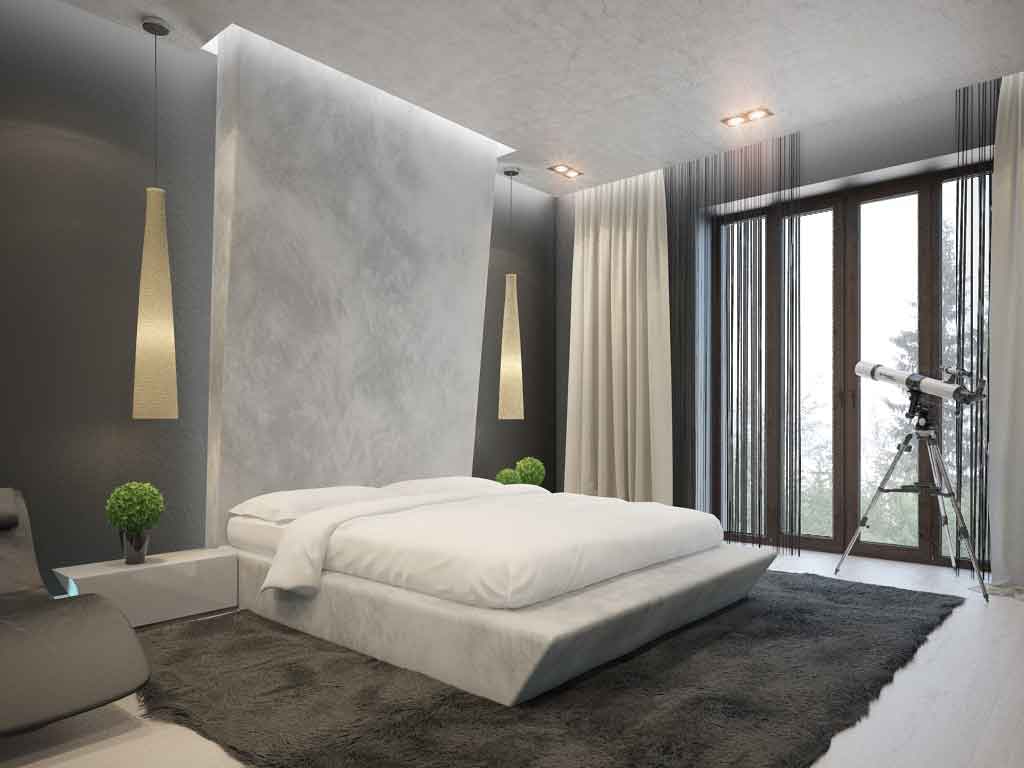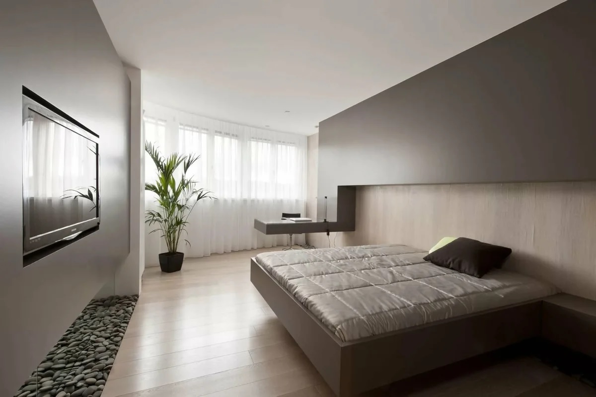 El lugar central en el dormitorio minimalista está ocupado por una cama grande. A los lados se colocan mesitas de noche, un tocador. Con la ayuda del color, puede hacer que una habitación sea conservadora, elegante, extravagante, estrecha o expandir la habitación. Al elegir los materiales de acabado, se debe prestar especial atención a su respeto por el medio ambiente.