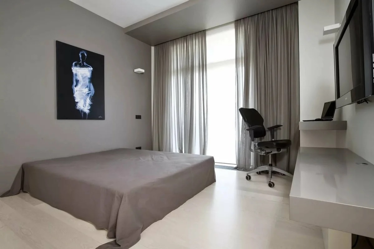 Si el área lo permite, puede hacer un armario separado en el dormitorio. Esto le permitirá identificar todas las cosas en un solo lugar y crear un sentimiento de pureza y libertad. Las puertas se hacen lo más invisibles posible, pintadas en el color de las paredes, cualquier neutral. Es mejor no usar la decoración para decorar las aberturas, de modo que no atraiga la atención y no distraiga del diseño general.
