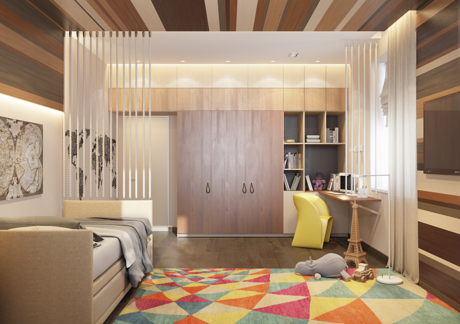 Un piso de varios niveles ayudará a identificar áreas funcionales, un área de juego, un lugar de descanso equipado en una colina. En una especie de podio también colocar una cama, armario.