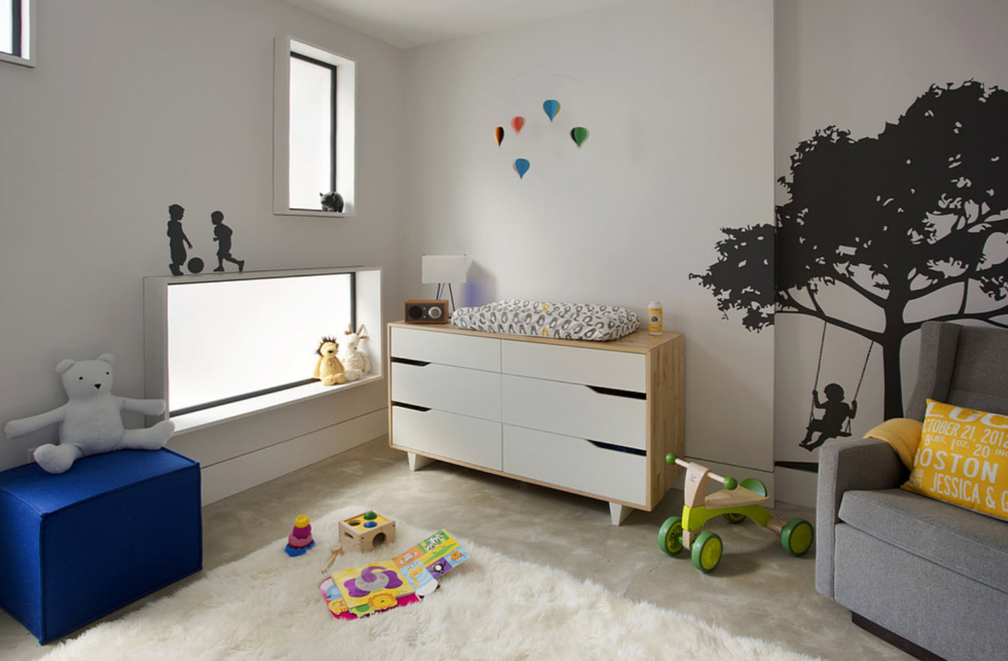 En una guardería minimalista, un sistema de almacenamiento para juguetes y artículos personales debe estar bien pensado. Los gabinetes extraíbles con ruedas, mini cajas y cajas serán apropiados. Se pueden hacer capacidades de varios tamaños con varias celdas para colocar rompecabezas, diseñador, peluches,artículos para dibujar, modelar y otras bagatelas.