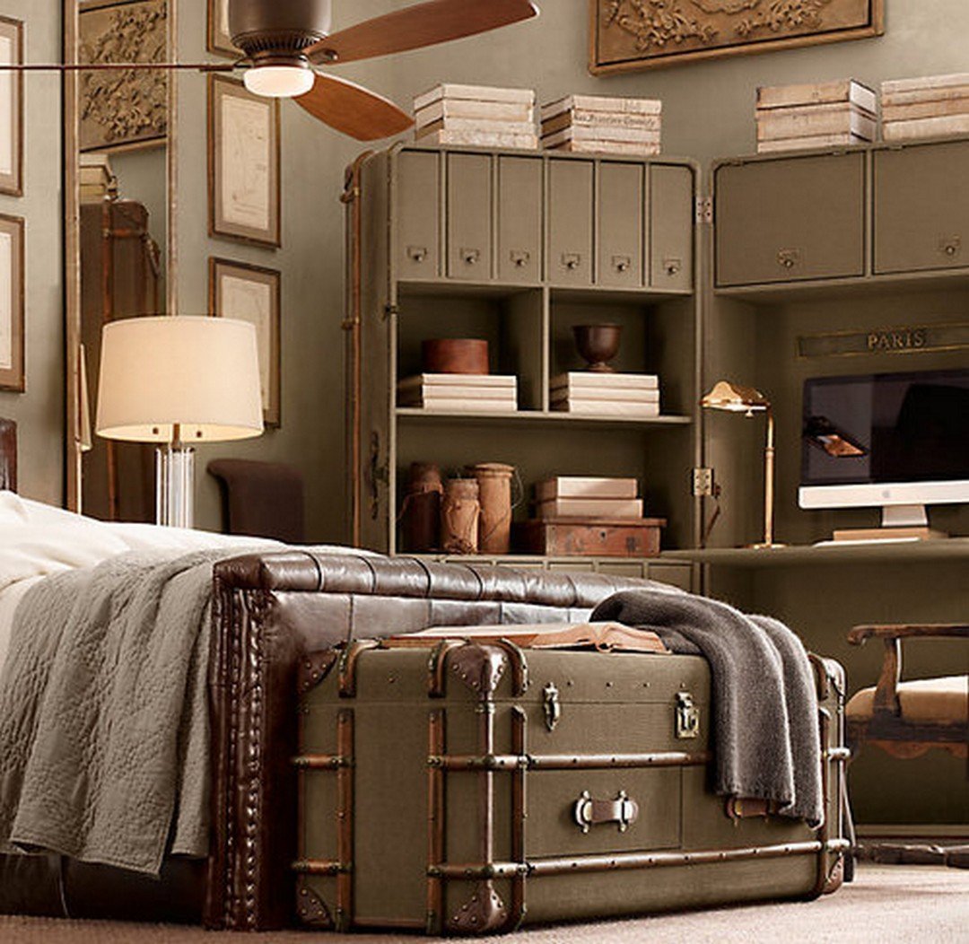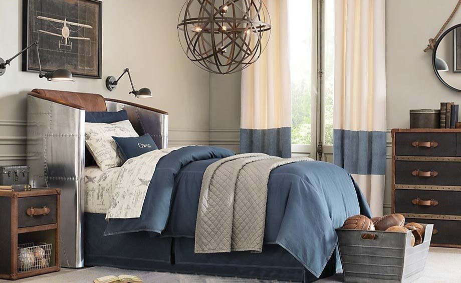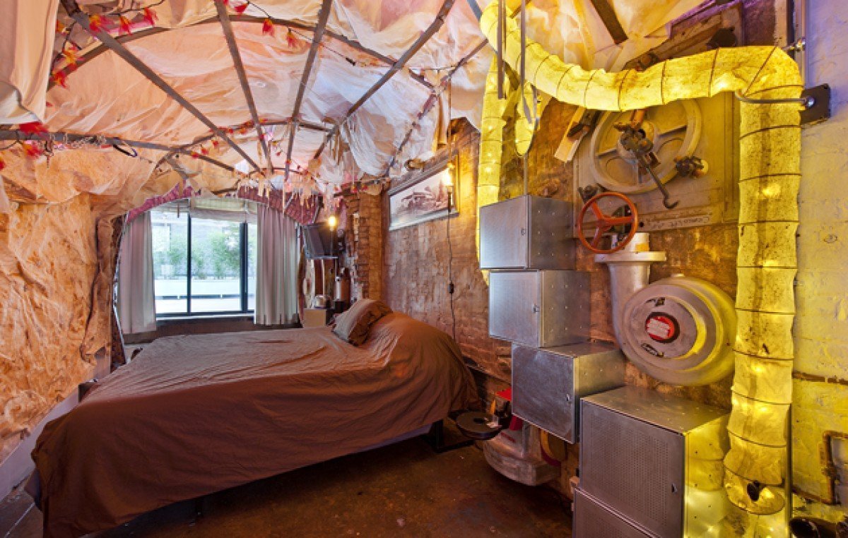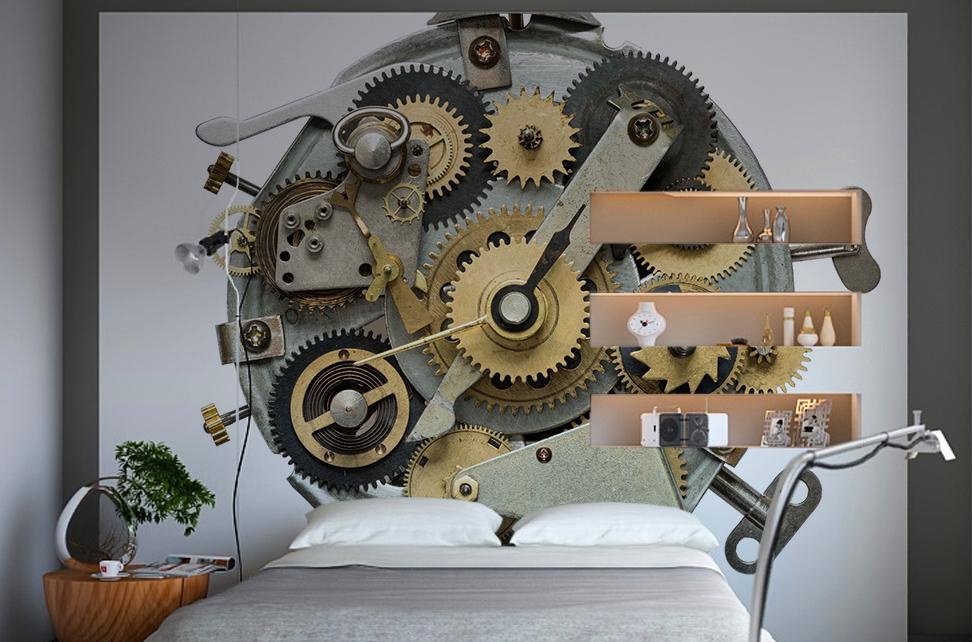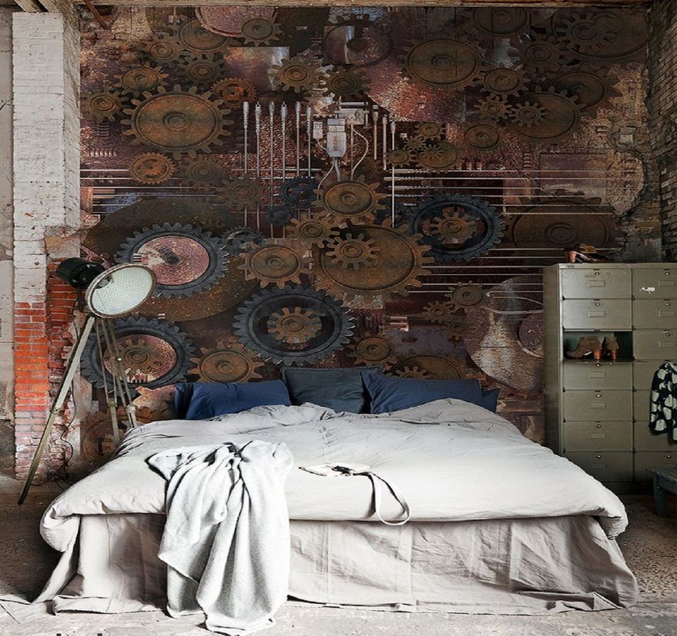 En el dormitorio puede crear un búnker real, la cabina del barco o la cabina de un submarino. La cama es engorrosa, hecha de madera pesada y duradera con tallas pulidas en las mejores tradiciones de la época victoriana. Está cubierto con telas ásperas de tonos grises, azules, burdeos o lilas. Se puede colocar una brújula gigante, un reloj impresionante, un dibujo antiguo o una composición abstracta de engranajes obligatorios, grúas, pernos y otros atributos mecánicos sobre las cabezas de las personas que duermen. Las paredes se pueden decorar con papel tapiz de acero gris que imita las láminas de metal, y la habitación se puede dividir en zonas con arcos decorativos, mejorando la semejanza con un submarino. Un tocador clásico o una cómoda simple está decorado con tubos y decorado con un globo en la parte superior. Todo el dormitorio debe respirar el espíritu del futurismo, al que los clásicos conservados en él se resisten desesperadamente.