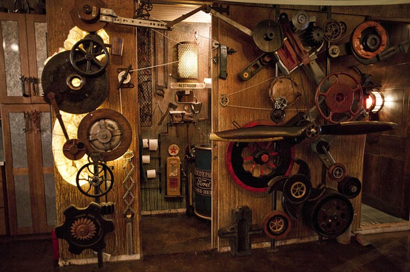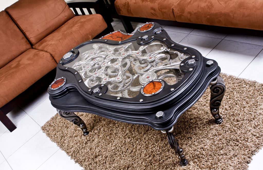 En un apartamento steampunk, es obligatoria la presencia de globos en soportes dorados, mapas, teléfonos antiguos, binoculares, barómetros, máquinas de escribir, planos, brújulas y accesorios de viaje que se envían en expediciones peligrosas bajo su propio riesgo. Naturalmente, no se olvide de tubos de latón, pernos, pistones, palancas, engranajes y una gran cantidad de engranajes de diferentes tamaños. Algunos de ellos pueden dar un brillo metálico, partes recientemente pulidas, y algunos envejecen artificialmente y se contraen con óxido.