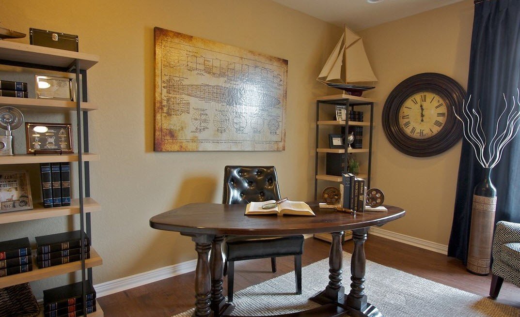 El estilo de la sala de vapor se puede amueblar con muebles tapizados en cuero marrón oscuro. Las ventanas están cubiertas con cortinas pesadas con un patrón clásico retorcido. En las paredes, los retratos familiares se alternan con viejos mapas debajo del vidrio en marcos de bronce. En los estantes, se ubican libremente cajas maltratadas, un catalejo en un soporte dorado, una brújula y un barómetro de un diseño extraño. La alfombra suave en el piso sigue siendo del mismo color marrón, y la pared está decorada con papeles pintados de color beige con una imagen discreta de un mapa mundial. Una de las esquinas puede estar "dañada por el tiempo": no hay fondos de pantalla, pero una parte del ladrillo ha quedado expuesta. La mesa de centro está hecha de una combinación de tubos de vidrio y latón. En lugar de una lámpara, tiene una composición original de tubos, pernos y engranajes, que se corona con una lámpara incandescente simple. El mueble del televisor está decorado con láminas de metal con remaches ásperos, y el milagro de la tecnología se parece a una de las ventanas del capitán de Nautilus, Nemo.