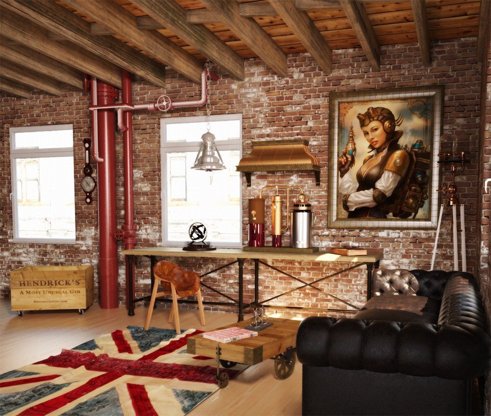 No confunda la decoración de la sala Steampunk con el resultado del descuido habitual de los propietarios, que son demasiado vagos para ocultar las baterías o tuberías de calefacción. El estilo nace sobre la base de la armonía de la elegancia con la grosería. Esto se puede llamar la tesis principal de la dirección.