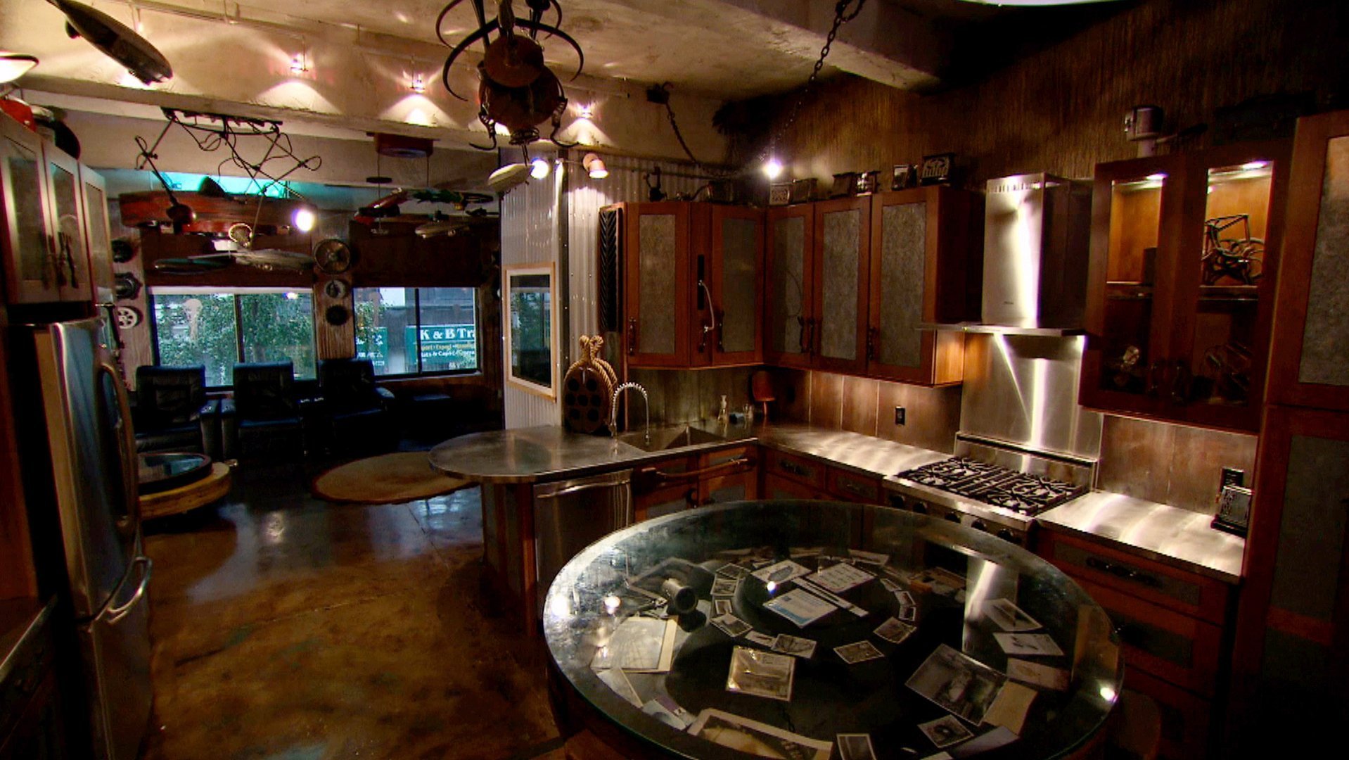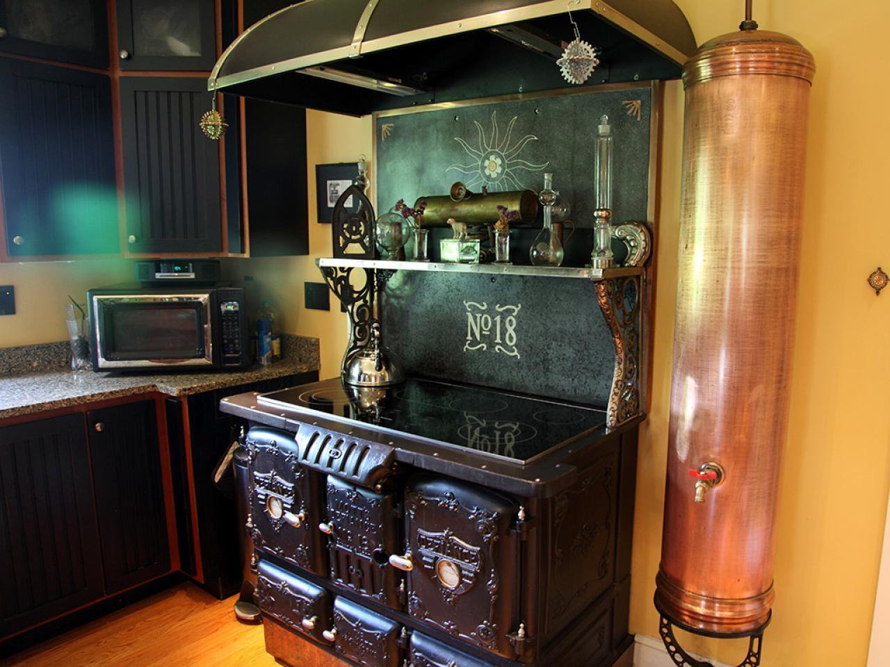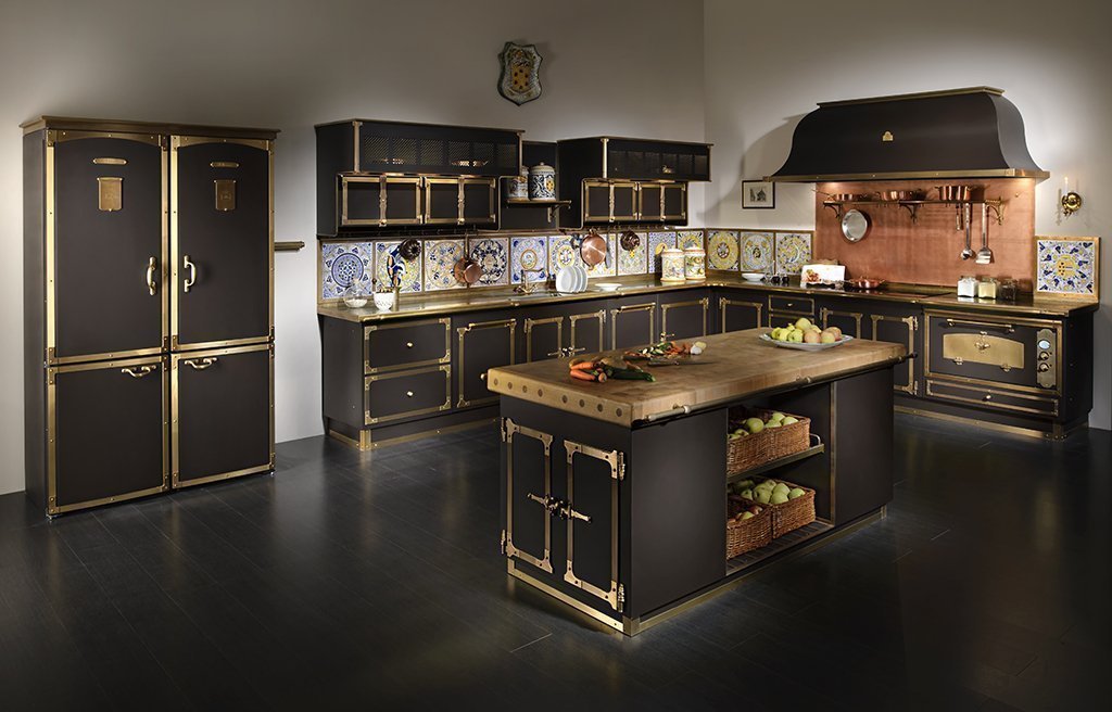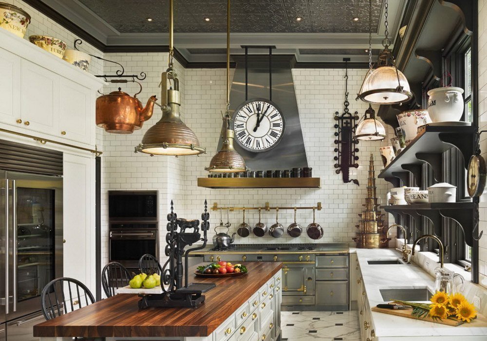 Una cocina estilo steam-punk se parece más a un laboratorio para realizar experimentos innovadores que a una sala de cocina. El tablero de la mesa y el área de trabajo principal son de madera (cerezo, roble) o mármol. El piso es de baldosas, imitando la textura y el color de la piedra. El conjunto está hecho en colores oscuros o claros sin concesiones. Las manijas de los muebles son necesariamente de metal, de estilo victoriano. El bronce y el bronce se ven espectaculares contra el fondo de ébano, que a su vez contrasta con la colocación de ladrillo blanco en las paredes. También colocan paneles grandes con un conjunto caótico de elementos "técnicos".