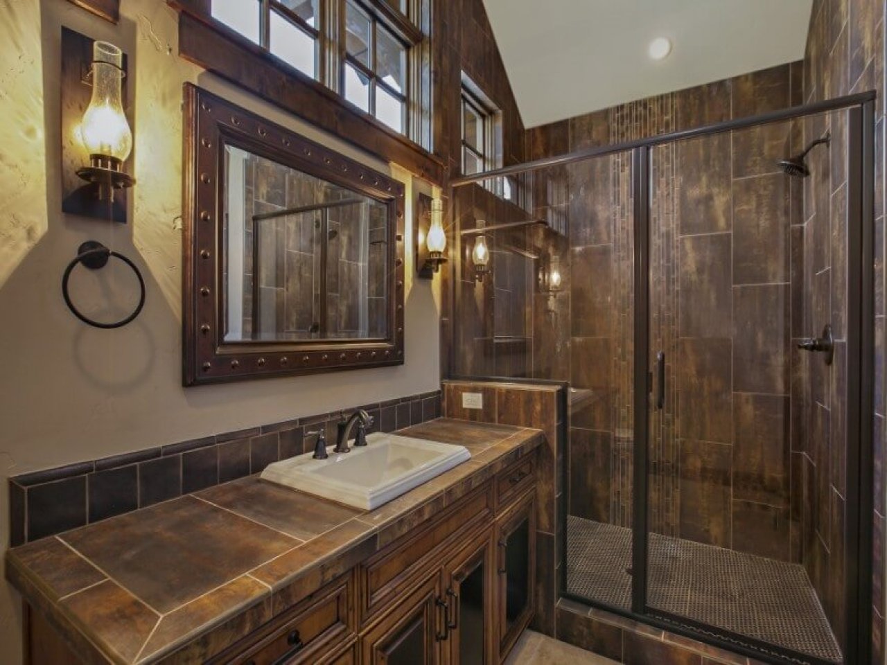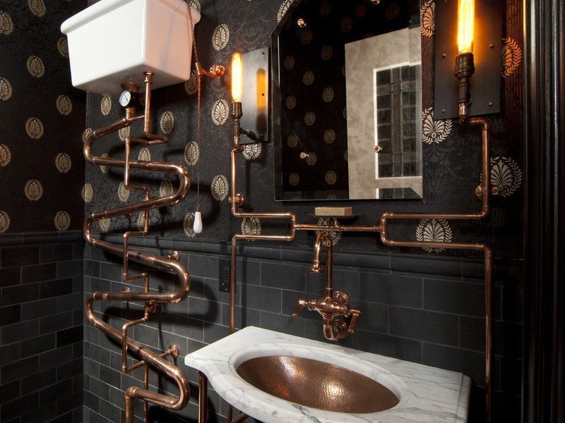 Las paredes del baño están decoradas con papel tapiz impermeable con un patrón gráfico descuidado. Naturalmente para esta sala, las tuberías de agua en ningún caso se esconden. Por el contrario, se exhiben públicamente y, a veces, se reemplazan por otros más voluminosos y multicomponentes (con una gran cantidad de flexiones y rodillas). El piso también está decorado en colores oscuros: está cubierto con azulejos con un patrón rugoso (mármol negro, piedra rugosa y porosa).