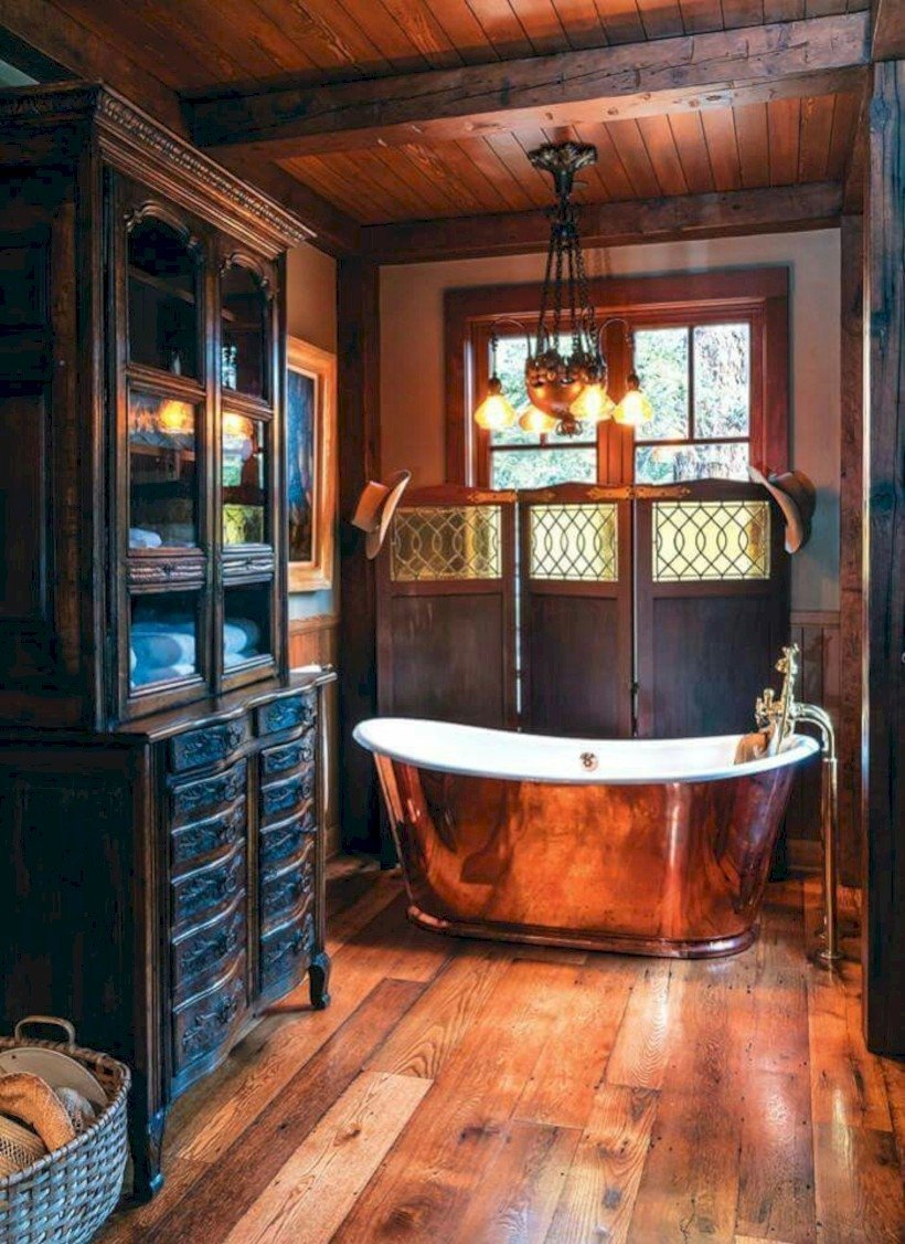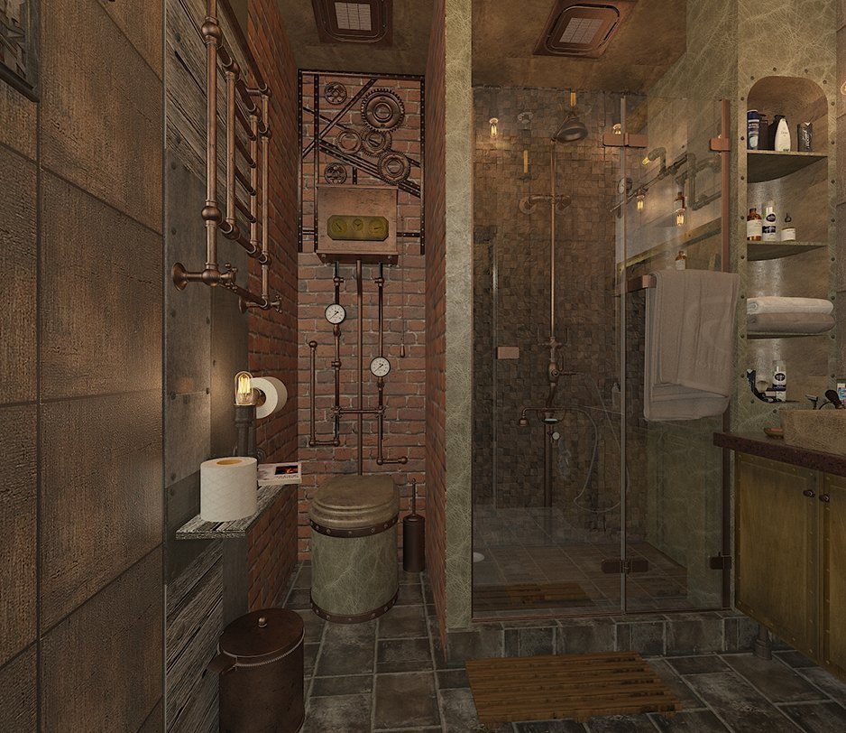 Si un pedazo de una pared queda accidentalmente "desnudo" cerca del baño, entonces los futuristas y los soñadores solo pueden hacerlo. Cuanto más grueso y natural se vea el ladrillo, mejor encajará en el tanque de vapor. El grifo y los grifos se seleccionan "antiguos" de latón, que parece "visto las vistas". El lavabo y el baño van de los estándares clásicos con esmalte blanco a la opción con un brillo de bronce. Algunos fanáticos particularmente creativos de steampunk logran estilizar la capacidad de baño de un submarino en miniatura con una tapa cortada y una escalera de metal para levantar "a bordo". Las cajoneras y los gabinetes para almacenar cosas se eligen de modelos clásicos que están decorados con las mismas tuberías y engranajes. La iluminación es tenue: hay suficientes superficies reflectantes en esta habitación que la dispersarán muchas veces.