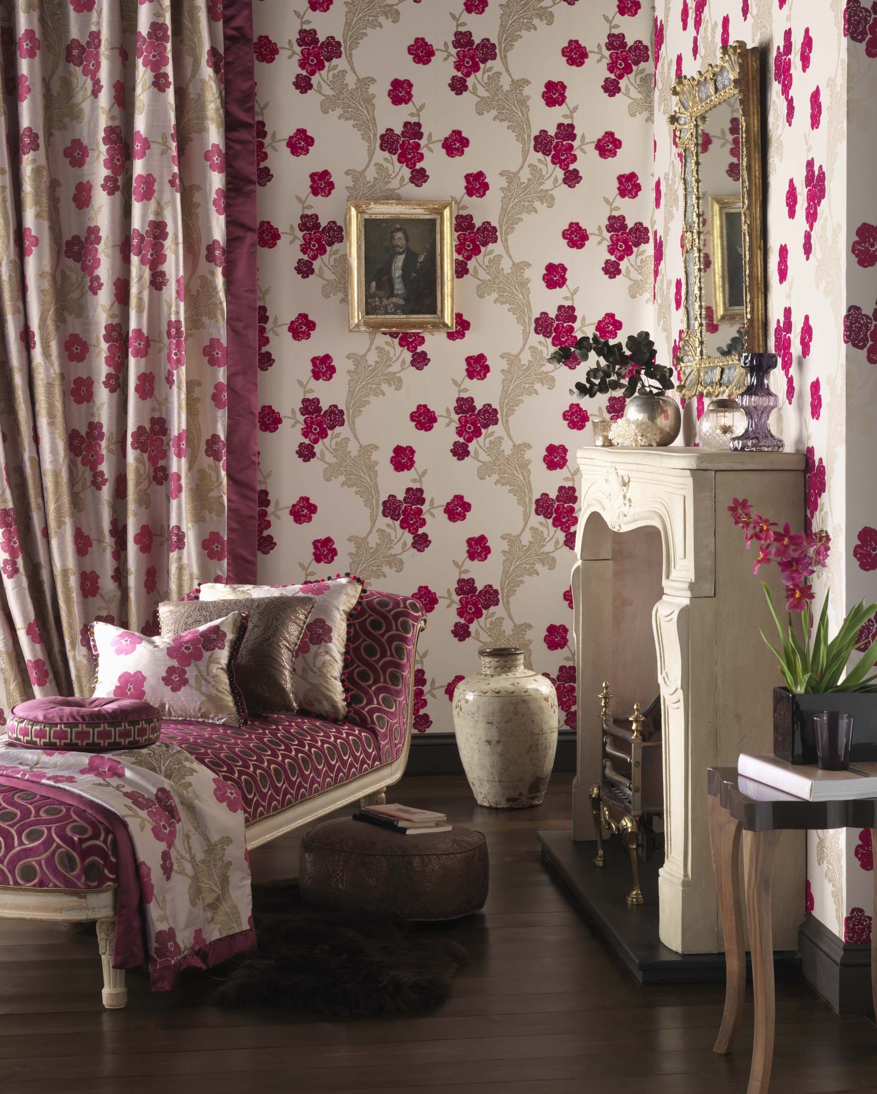 Maintenon. Sobre un fondo monofónico de la tela, se aplica un patrón que recuerda más a una impresión débil.