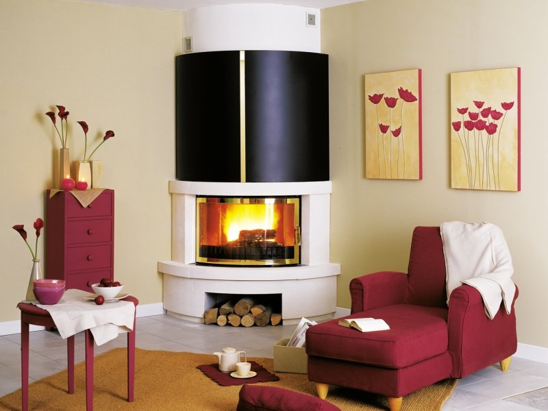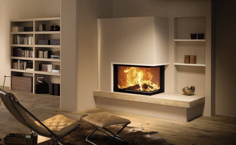 El diseño de las chimeneas de esquina es muy compacto, se pueden instalar no solo en una sala de estar grande, sino también en habitaciones con un área pequeña, por ejemplo, en un dormitorio o en una oficina. Debido a la ubicación entre las dos paredes, este diseño también calienta las habitaciones vecinas, lo que también es muy conveniente y práctico. Los modelos angulares pueden ser simétricos y asimétricos.
