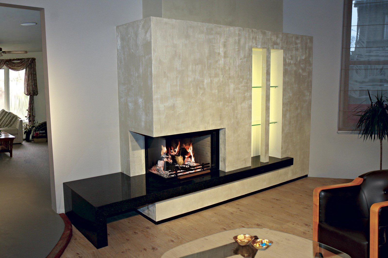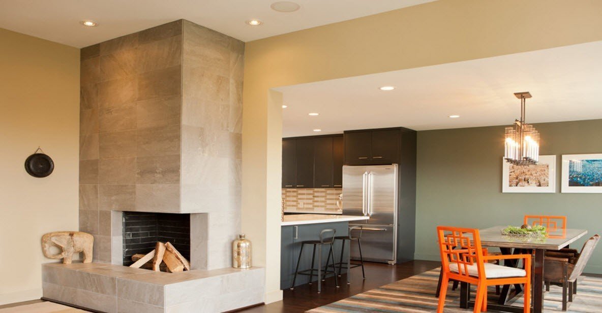 Una chimenea asimétrica se usa a menudo como un tipo de elemento para zonificar una habitación. Gran parte de la percepción del interior general depende del revestimiento y del diseño externo de la chimenea, pero estas son preguntas para diseñadores profesionales. Si lo desea, puede ver la foto, elija la mejor opción.