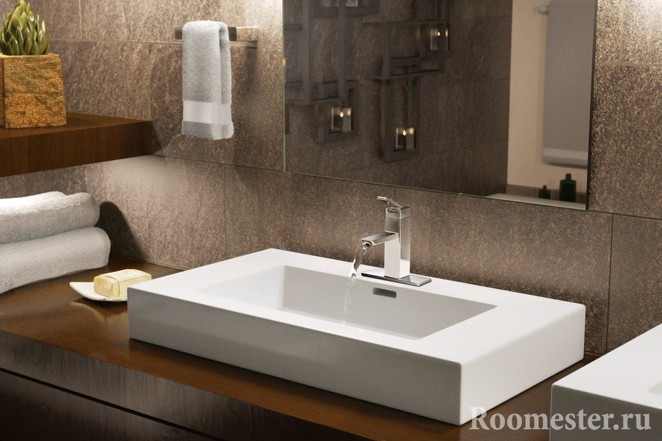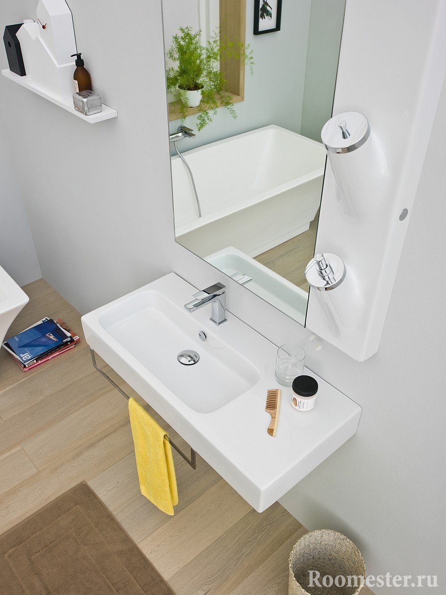De arriba. Los productos con un pie o fregaderos montados en una encimera son adecuados para una habitación espaciosa. Una opción funcional permite a los propietarios usar una cómoda para almacenar cualquier artículo.