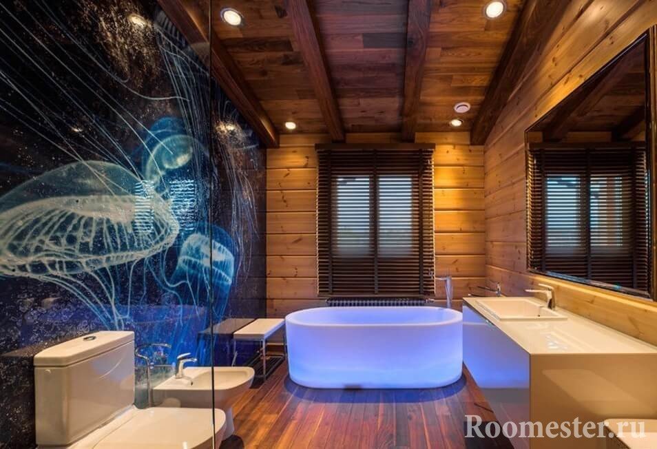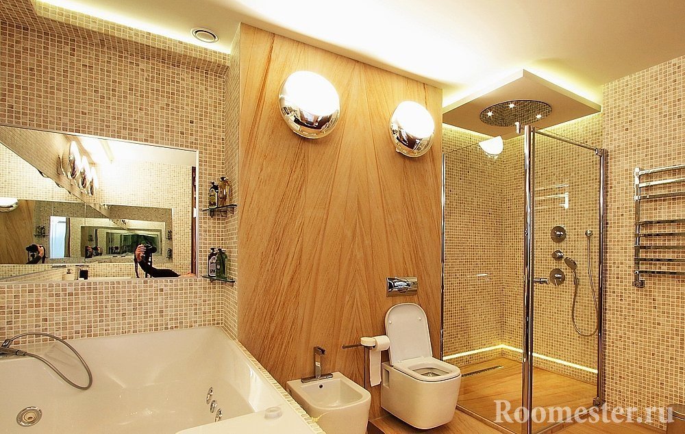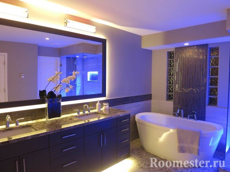 Otro punto importante debe ser la iluminación reconocida. La percepción de la luz depende directamente de la intensidad de la habitación. La potente luz enfatiza todas las fortalezas del interior, crea acentos. La forma de la lámpara puede ser cualquiera, pero es mejor abandonar inmediatamente el voluminoso candelabro. Ella "comerá" demasiado espacio. Algunos anfitriones prefieren una iluminación tenue. Es fácil de crear usando un atenuador que controla la intensidad del flujo de luz. Crear una atmósfera íntima en la decoración de un baño acogedor es solo su parte.