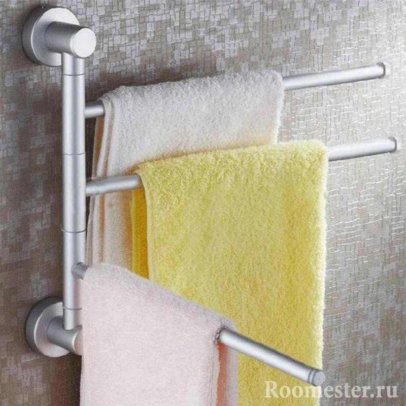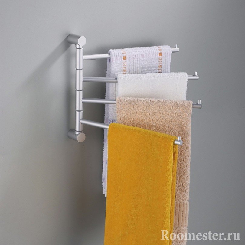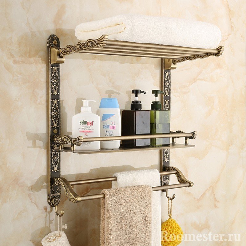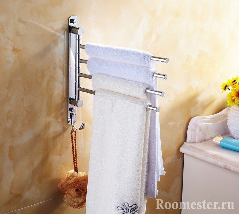 Los titulares más populares y familiares incluyen un gancho. Este es un método económico y fácil para crear hermosos pliegues con textiles. Sin embargo, es difícil llamarlo una opción conveniente, ya que la toalla está mal fijada. Lo mismo puede decirse de los anillos. Se ven más confiables, pero aún incómodos. Los expertos recomiendan usar cestas colgantes alternativas en lugar de un gancho. Le permiten almacenar una variedad de cosas. Los diseñadores prefieren la disposición de nichos compactos que se destacan claramente en el interior.