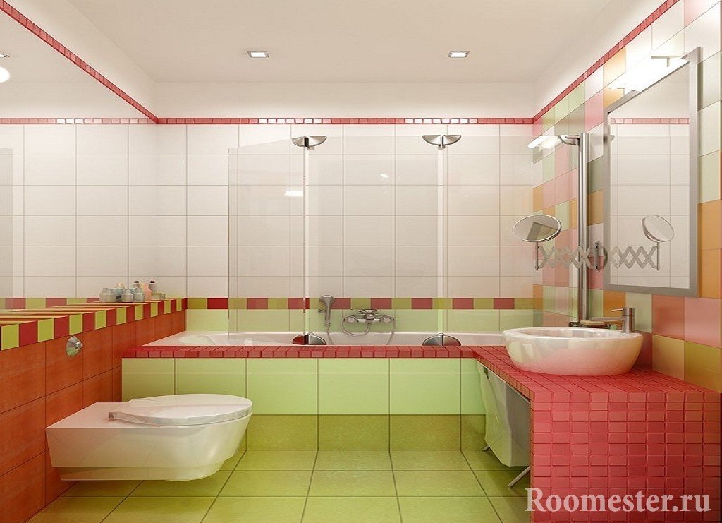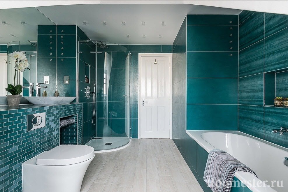 Es difícil encontrar un material de acabado más adecuado para el baño que el azulejo. Las excelentes propiedades de rendimiento del revestimiento protegen de manera confiable las paredes de cualquier efecto de temperatura y agua. El material duradero también soporta fácilmente los productos químicos domésticos. Su superficie dura no se agrieta sin razón, no se hunde debajo de pesadas placas rectangulares. El plano de arcilla cubierto con esmalte se distingue por su neutralidad a la suciedad, el brillo brillante y la saturación pura del tono de color. El material no combustible es fácil de cuidar, ya que no absorbe la humedad en absoluto. El único inconveniente de la baldosa es su baja conductividad térmica, debido a que casi siempre hace frío.