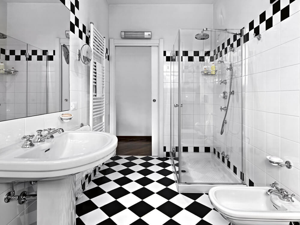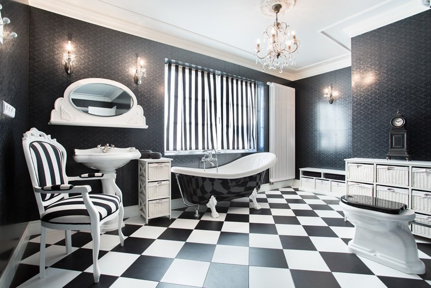 En un baño es necesario utilizar materiales resistentes a la humedad. Al hacer la habitación en blanco y negro, no puede cometer errores durante la instalación. Cualquier error cometido afectará negativamente el aspecto general de la habitación.Al elegir correctamente la proporción, alternando sombras contrastantes, puede cambiar la geometría de la habitación para mejor. En consecuencia, las proporciones proporcionadas incorrectamente afectarán negativamente la atmósfera en la habitación.