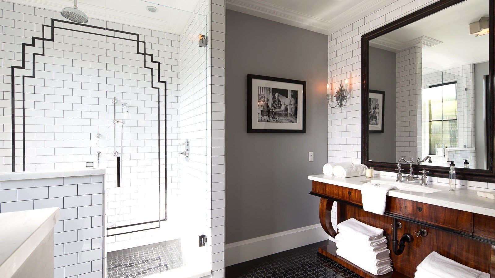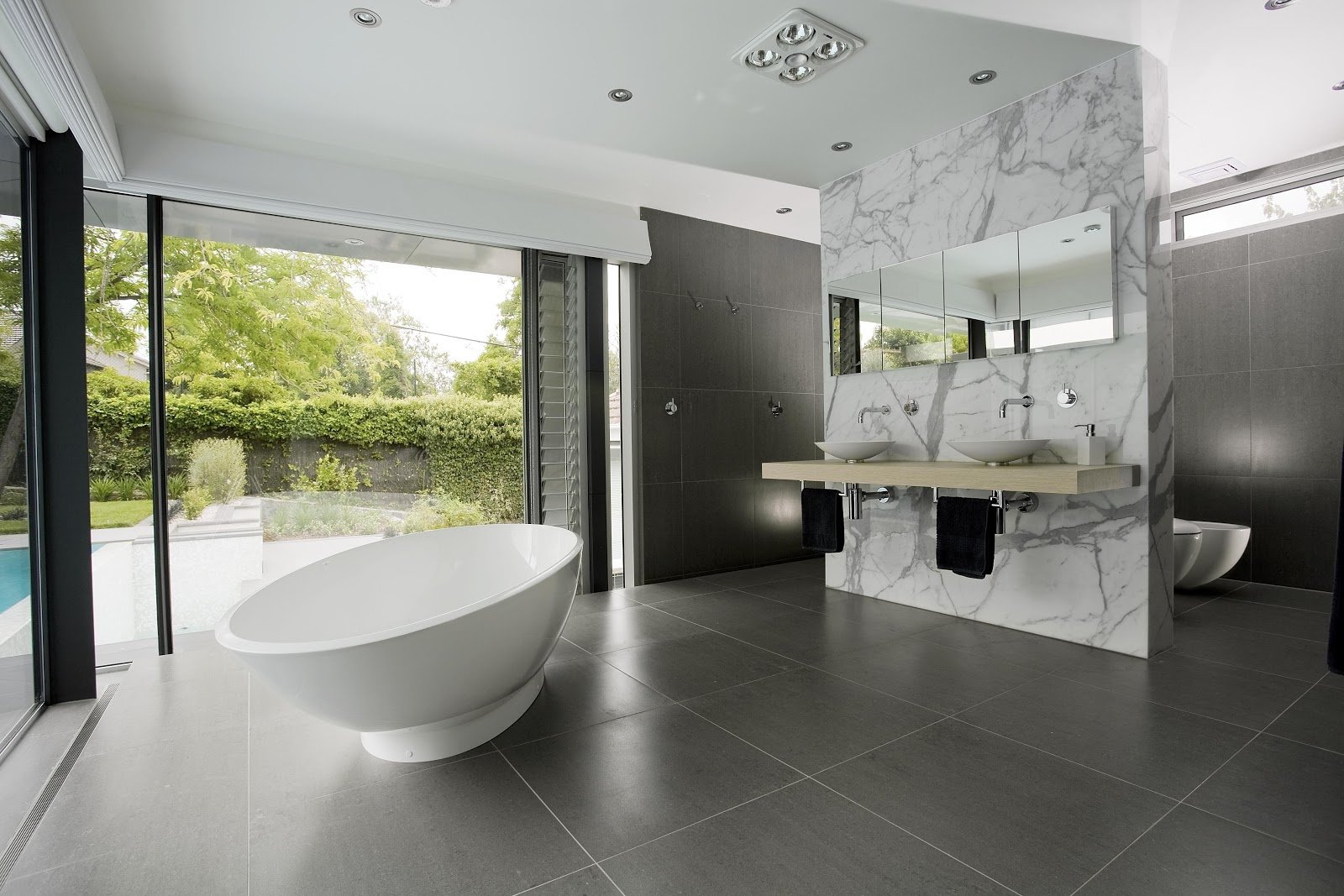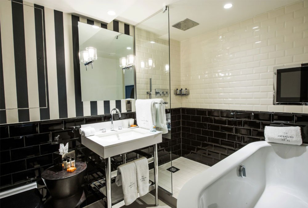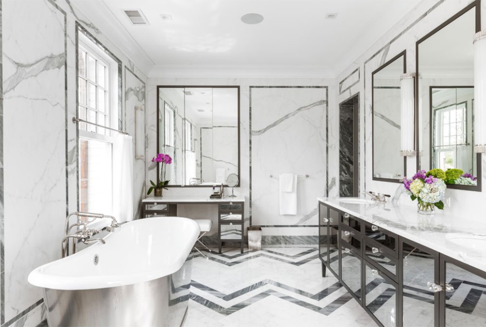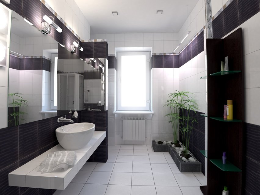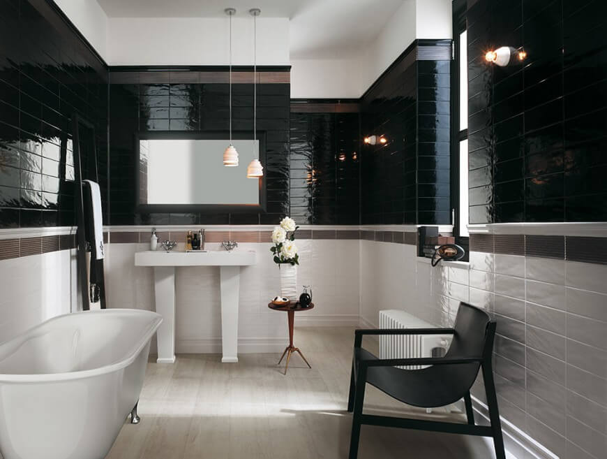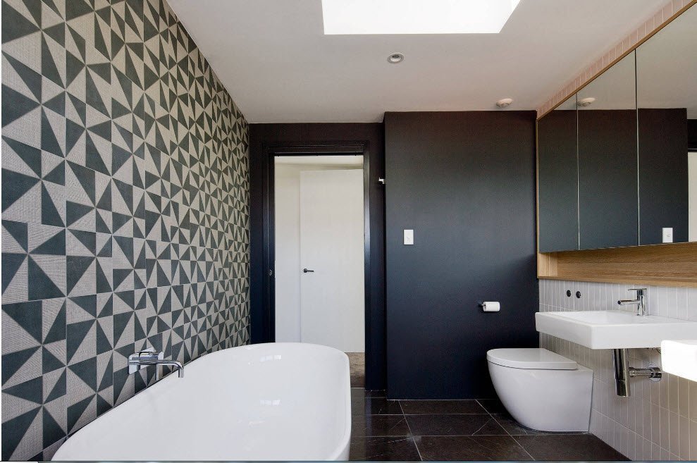 Los revestimientos de piso con patrones diagonales harán que la habitación sea más espaciosa, las rayas verticales en las paredes elevarán visualmente la altura de los techos, las inserciones horizontales expandirán el espacio. Cuanto más grande es el área del baño, más negro se le permite usar; Demasiado fondo oscuro creará un ambiente sombrío, aunque costoso.