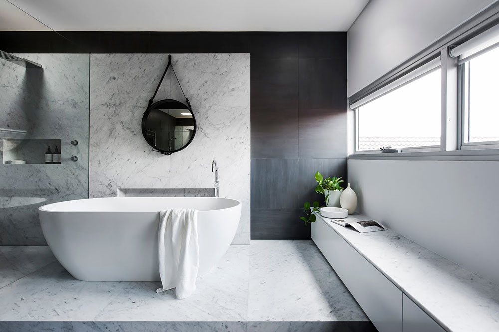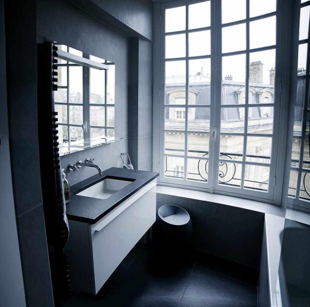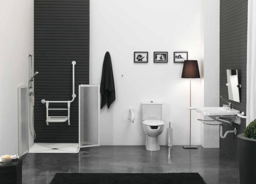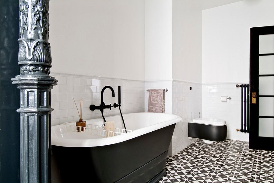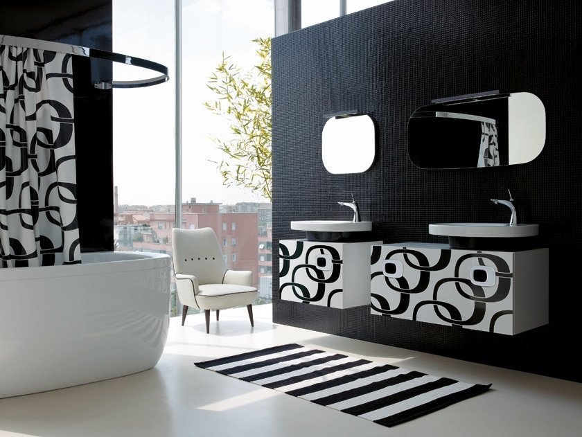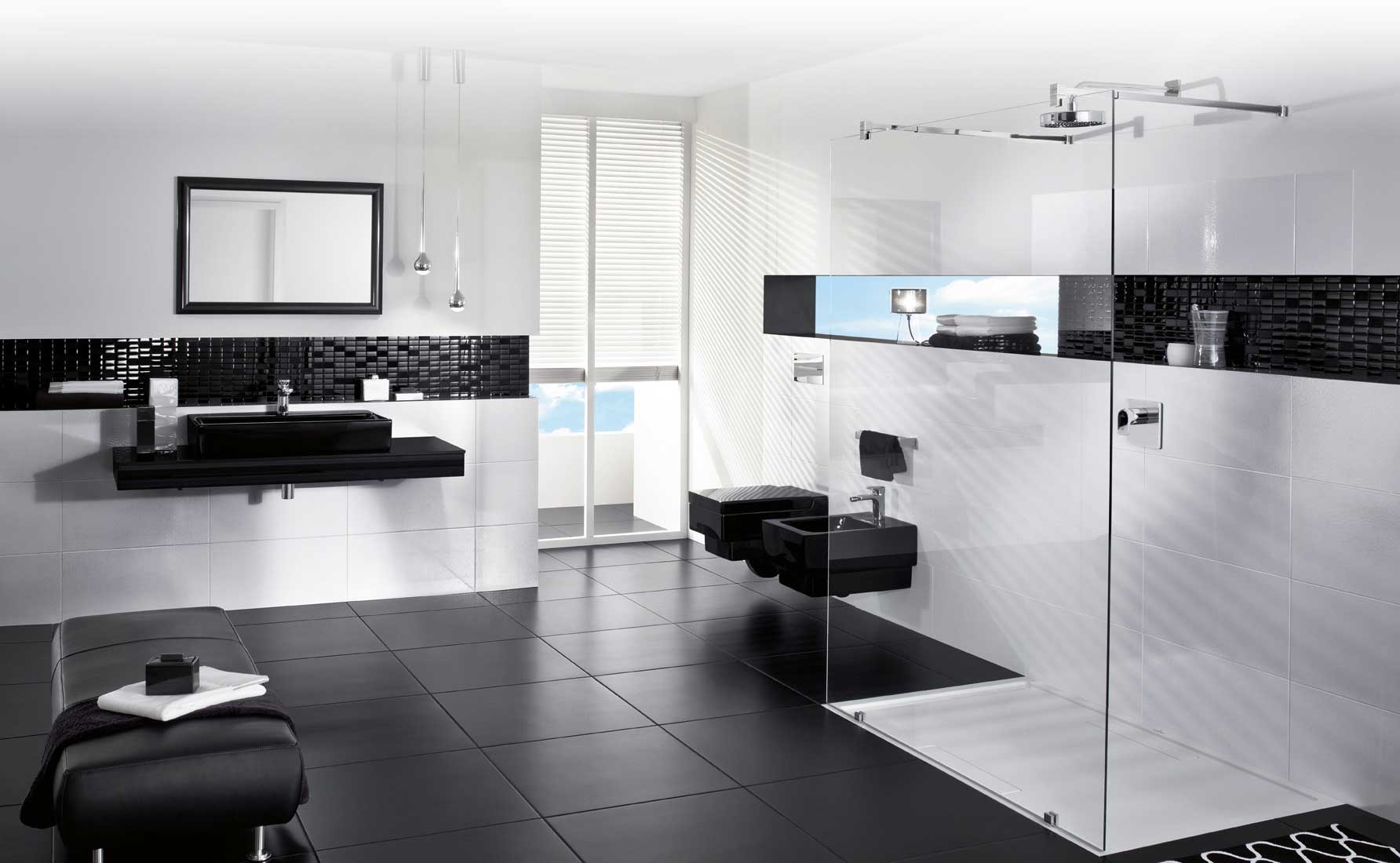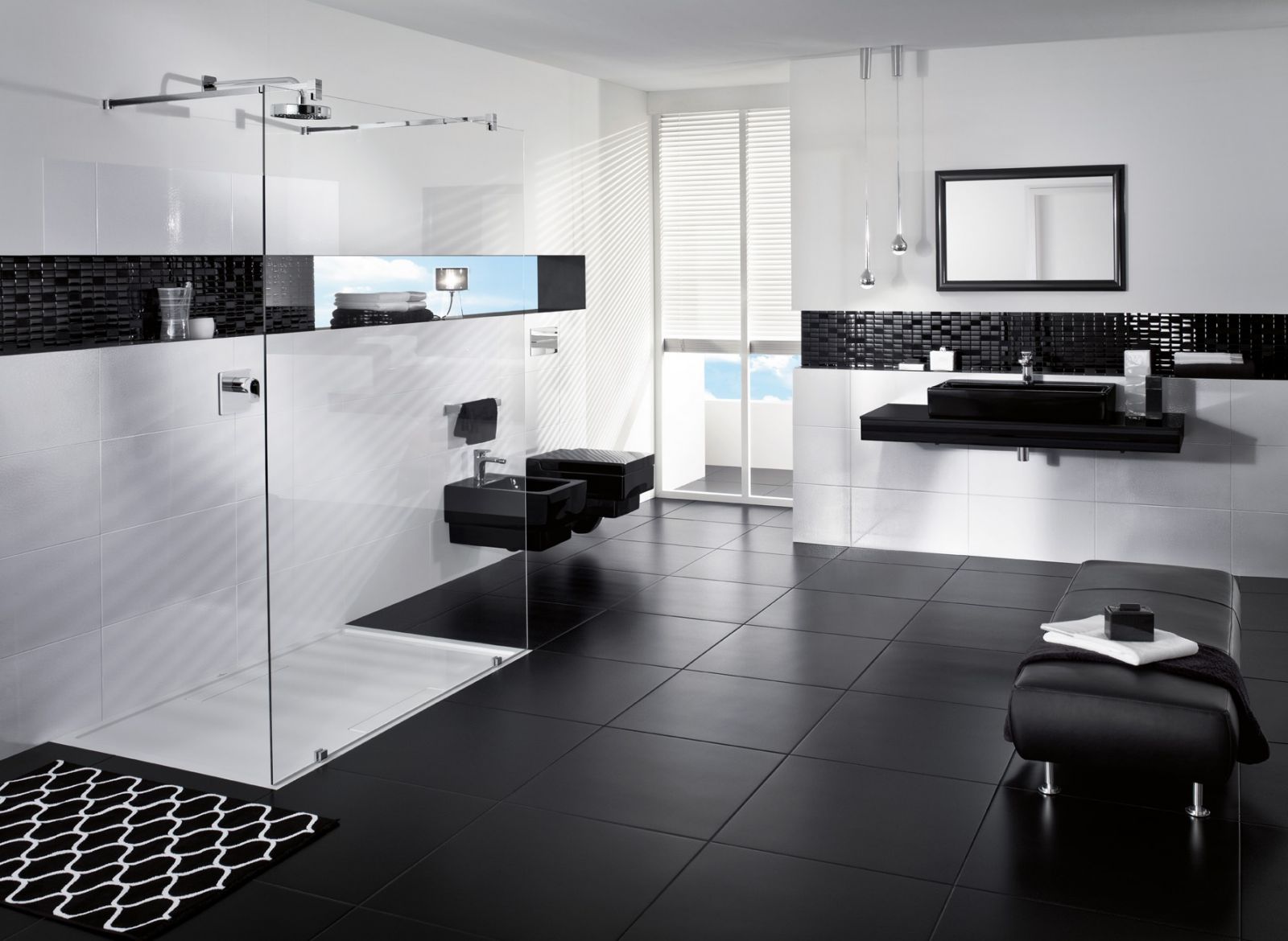 En el diseño de un baño en blanco y negro, los diseñadores se guían por el principio cuando los objetos mate están sobre un fondo brillante y viceversa.