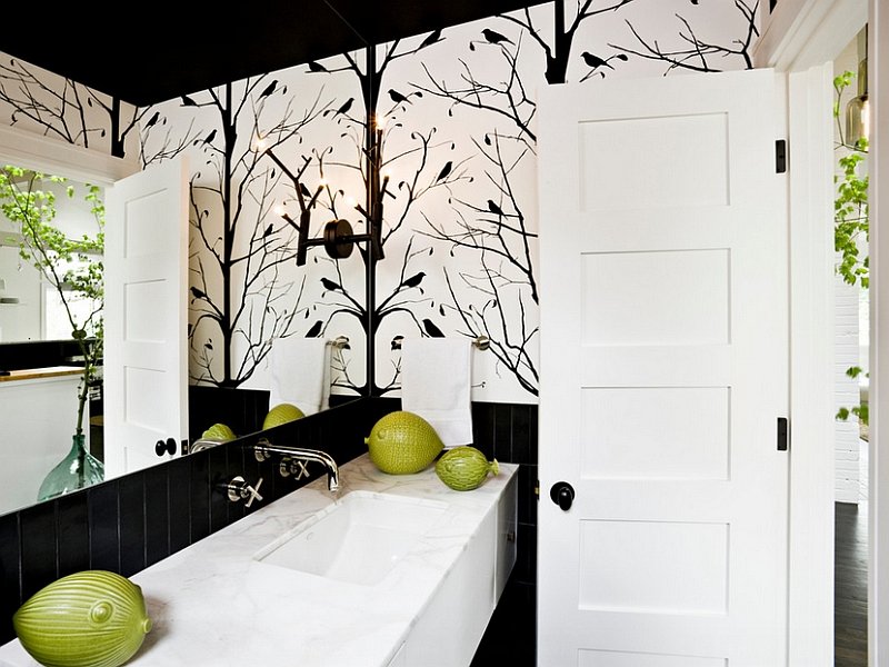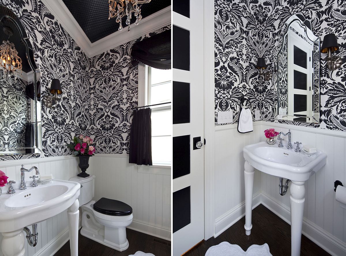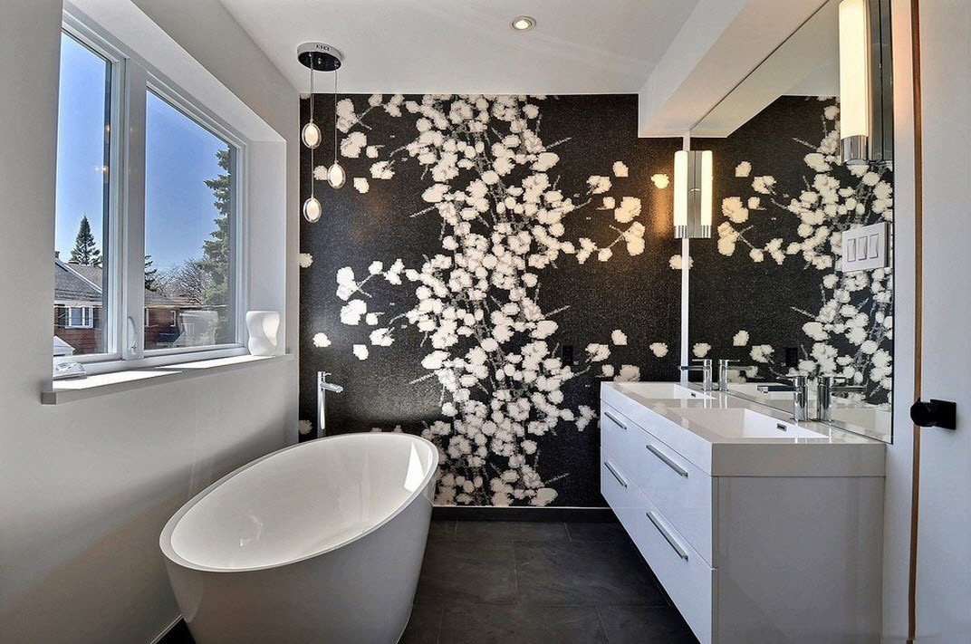 En los baños, a menudo se usan paneles de pared. La parte inferior de la pared está hecha de un material, la superior de otro. O los paneles se pueden resaltar con mosaicos negros y el resto de la pared en blanco contrastante. En habitaciones pequeñas, toda la pared está decorada en colores claros, pero con diferentes texturas. En un baño blanco y negro, las inserciones decorativas estampadas dispuestas verticalmente se ven espectaculares. Además, los papeles pintados a prueba de humedad, los murales, las baldosas cerámicas con impresión fotográfica, los adornos y los mosaicos se utilizan para decorar paredes. Las líneas horizontales, las inserciones expanden visualmente el espacio, las verticales elevan los techos. Si planea instalar tuberías blancas, entonces el fondo negro lo enfatizará favorablemente.Se resaltan sombras en blanco y negro, dibujos, zonas funcionales. La clásica gama monocromática se adapta a elementos, inserciones de color rojo, especialmente en un fondo negro.